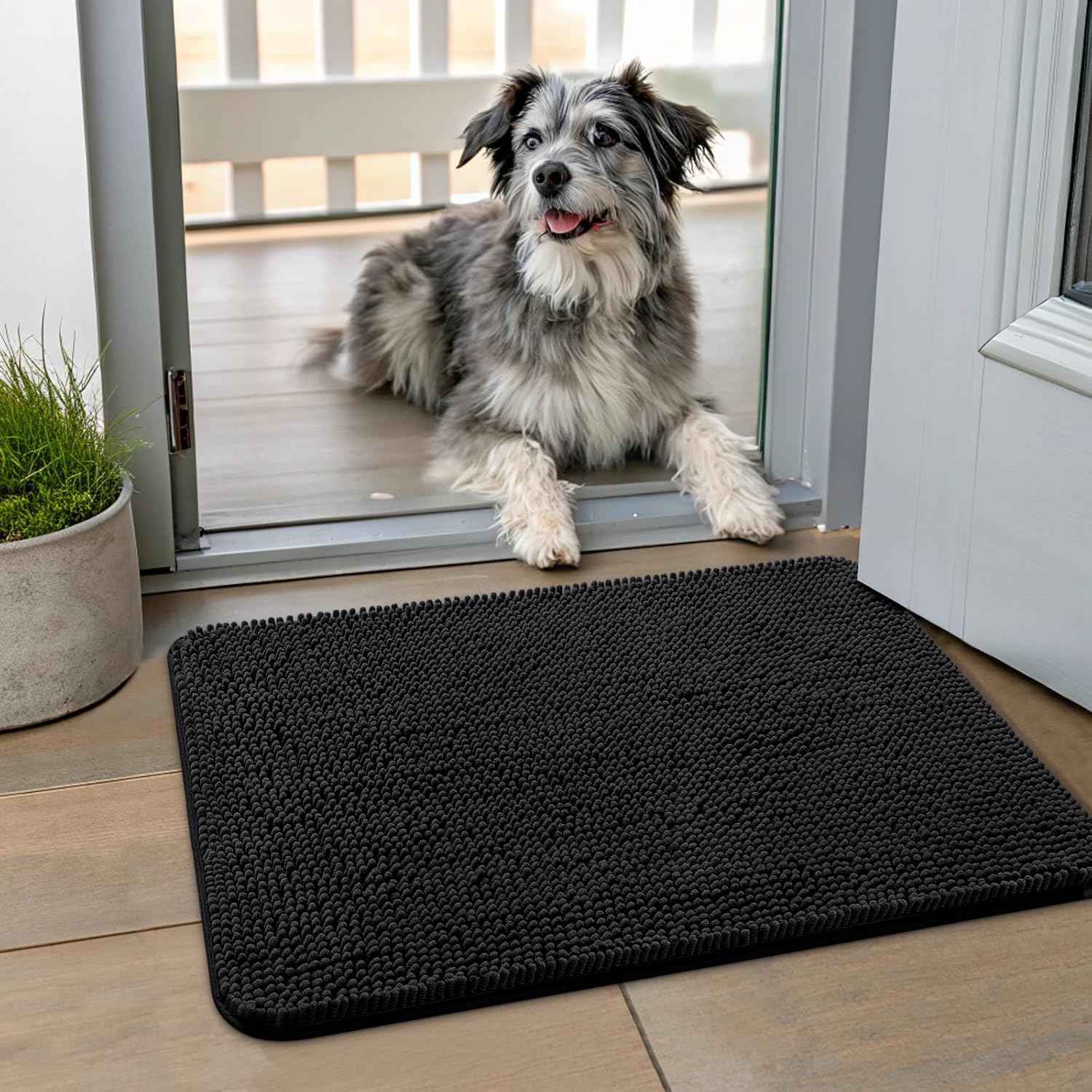 Smiry Dog Door Mat for Muddy Paws 24x16, Absorbs Moisture and Dirt Doormat, Non-Slip Washable Quick Dry Chenille Front Door Mat Indoor Entrance, Entryway Carpet for Inside Floor, Black