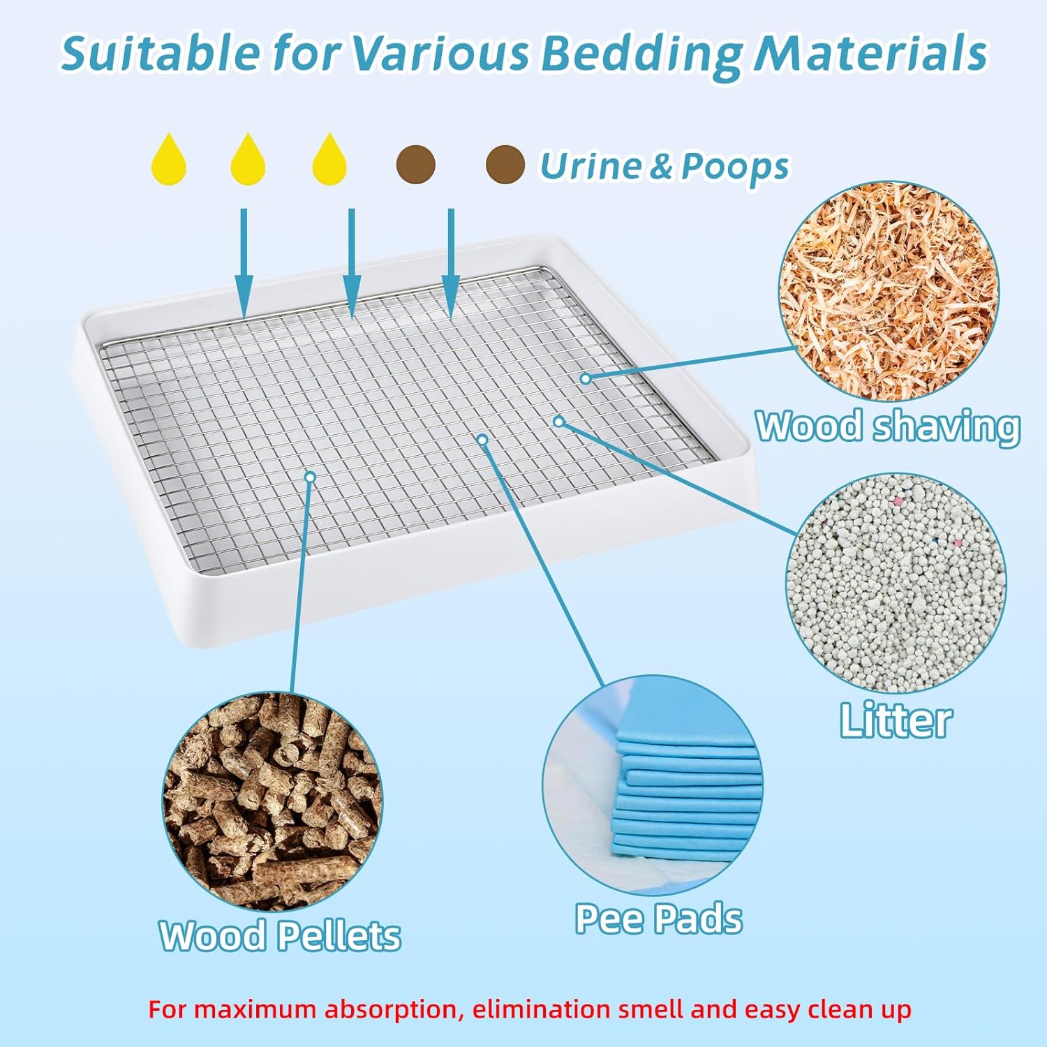 - Premium Material and Easy Cleaning: The pet litter box Made of high-quality thickened PP plastic body + stainless steel mesh, safe and odor-free, with smooth edges to ensure durability and pet friendly;Itâs been a breeze to clean- just simply pick it up, dump contents, wipe or wash with vinegar and water to remove pee stains, and place it back in your cage and no smell