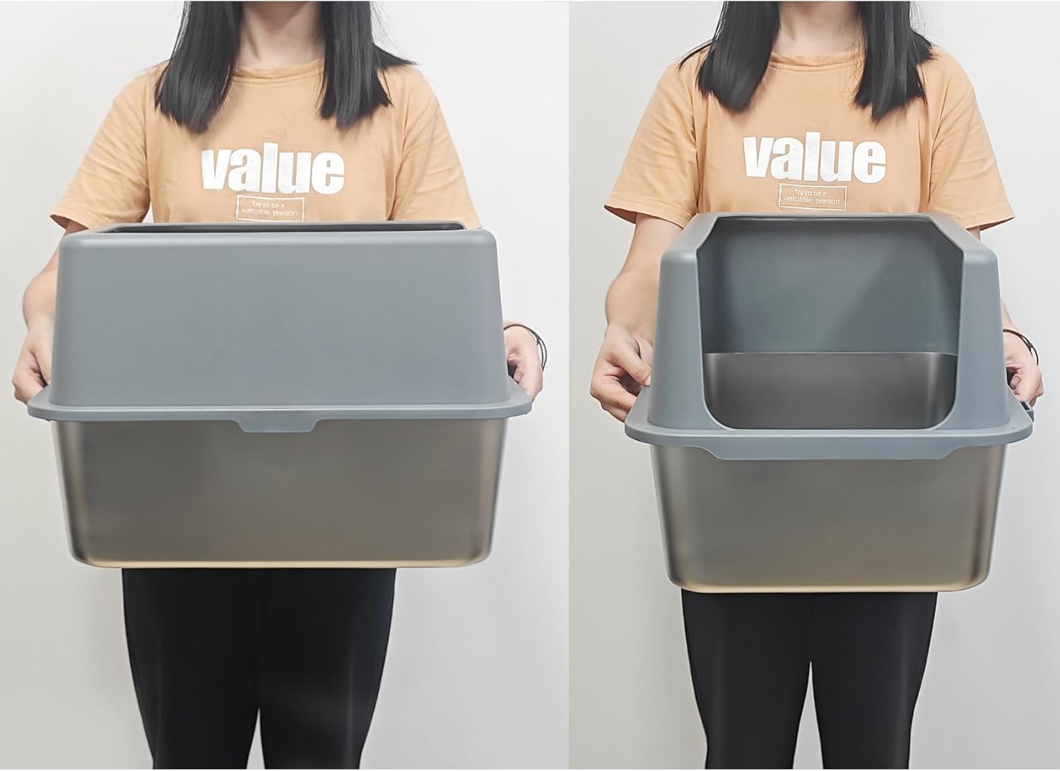 - Sturdy Stainless Steel MaterialďźStainless steel cat litter box with lid is made of high quality stainless steel metal, which is durable and has a long service life. Don't need to replace the steel cat litter box frequently. The stainless steel litter pan also features odorless, non-stick bottom, non-slip, no residual stains and smooth surface.