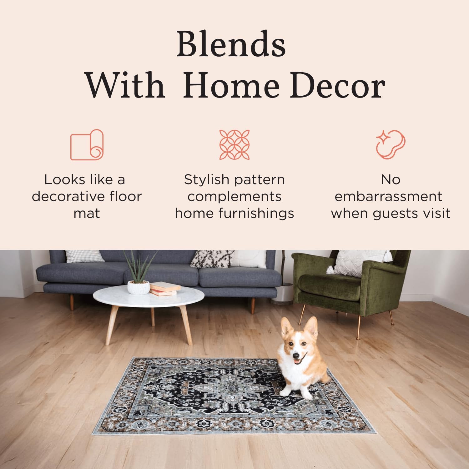 - LOOKS LIKE A DECORATIVE FLOOR MAT, NOT A PEE PAD - Finally, a pet pad that complements your home decor! Designed to blend seamlessly with your interior, these stylish waterproof pads eliminate embarrassment when guests visit. These pads enhance your home appearance while serving a practical purpose.