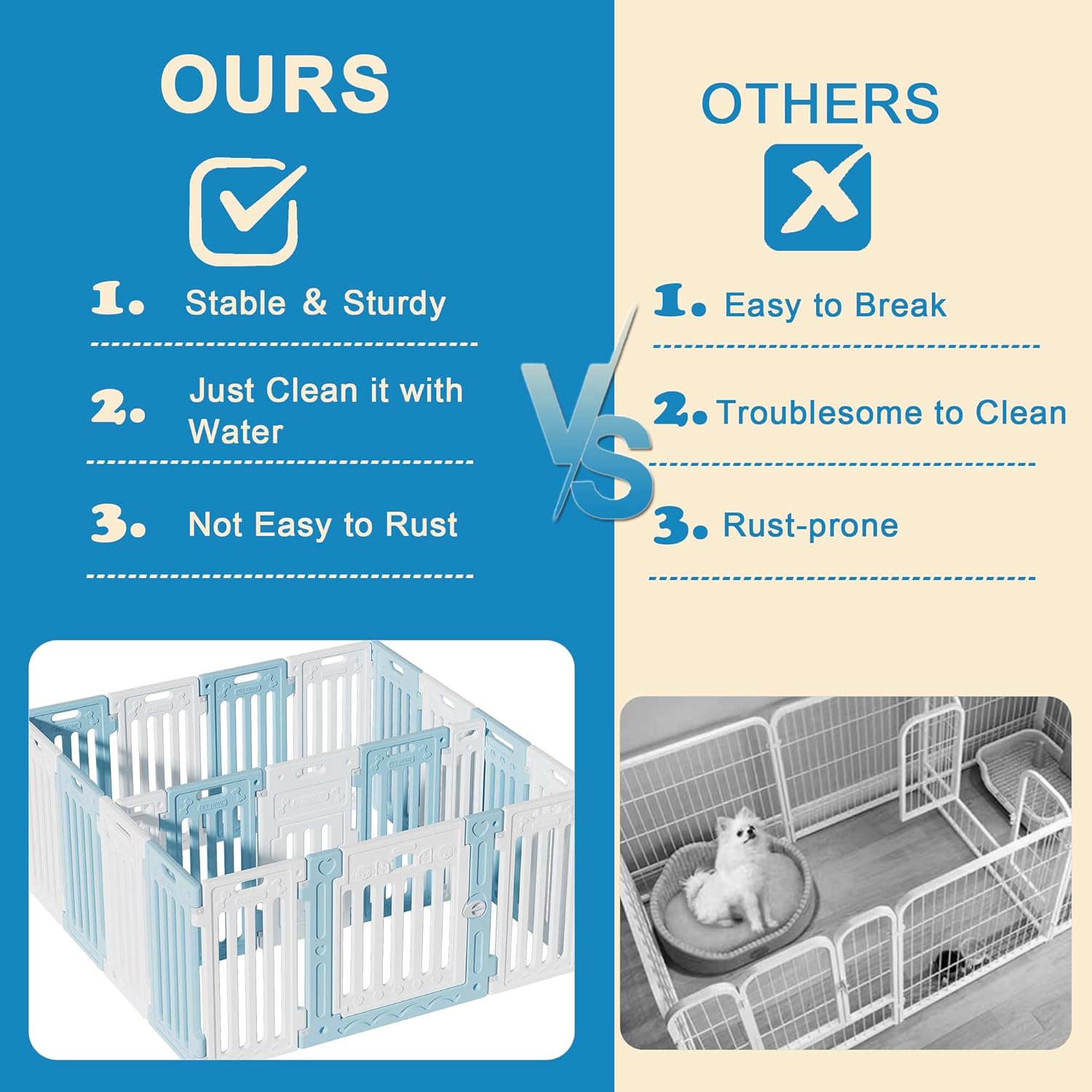 - DURABLE MATERIAL: Made of HDPE resin, our dog pens outside is safe, odorless, and durable. It's also chew-proof and gentle on your pet's skin. With this playpen, your dog can safely enjoy his time exploring and playing.