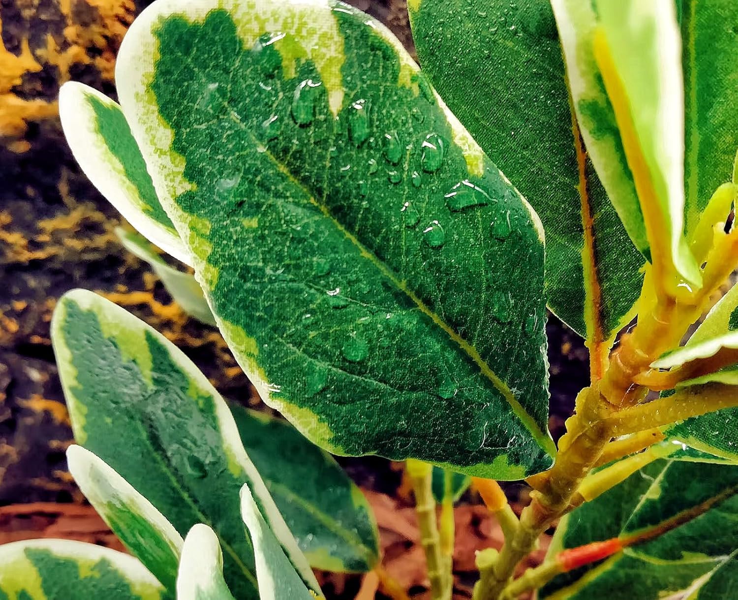 - EASY MAINTENANCE - Itâs easy to cleanďźeffortlessly clean and maintain by simply wiping with a damp cloth, eliminating the hassle of caring for live plants. Itâs waterproof , holds water droplets well for any creatures that only drink from dew and water droplets, such as chameleons and some geckos