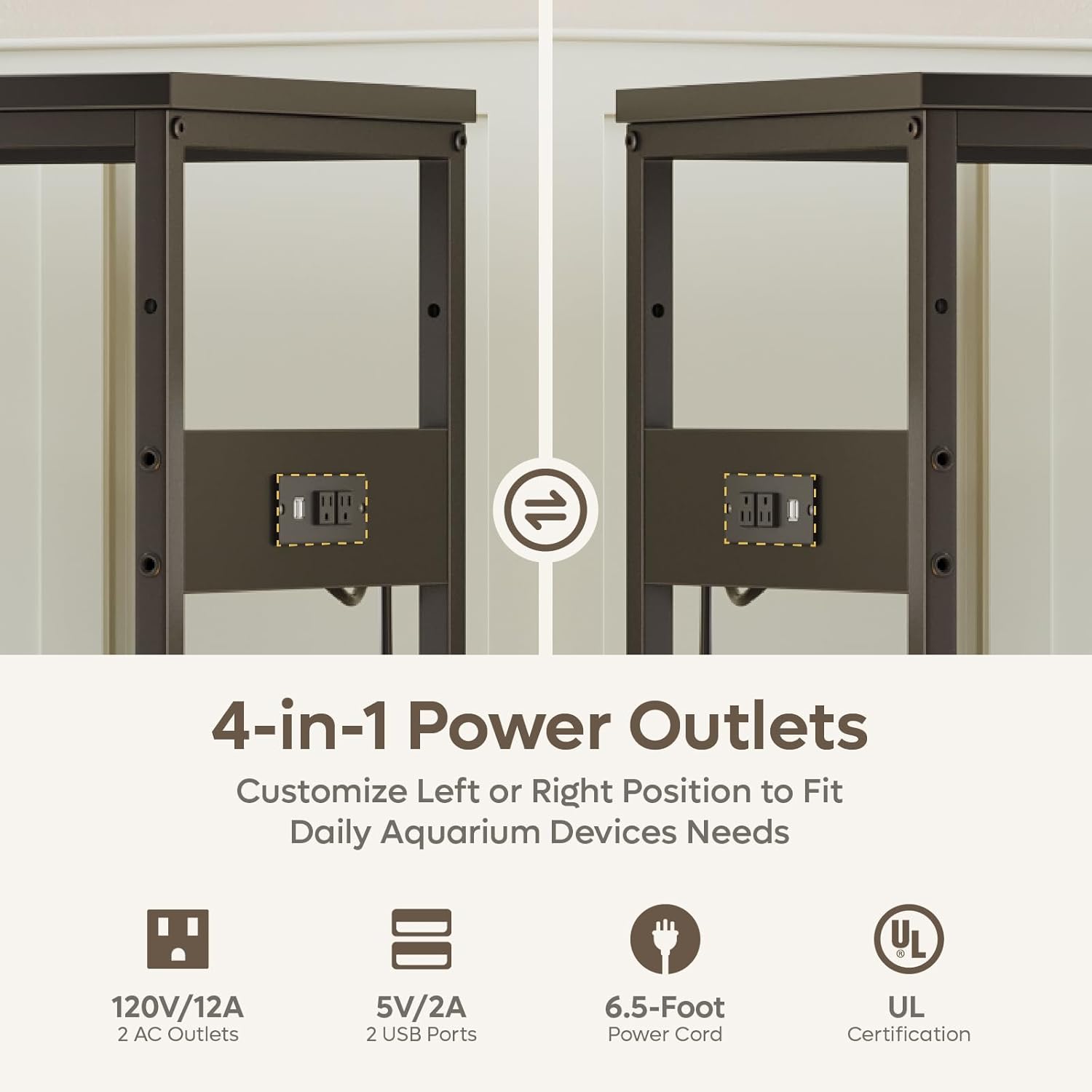 - 4-in-1 Power Outlets: The 29 gallon fish tank stand includes 2 AC and 2 USB outlets, installable on either side for flexible cable management, ideal for powering filters, lights, heaters, and charging devices