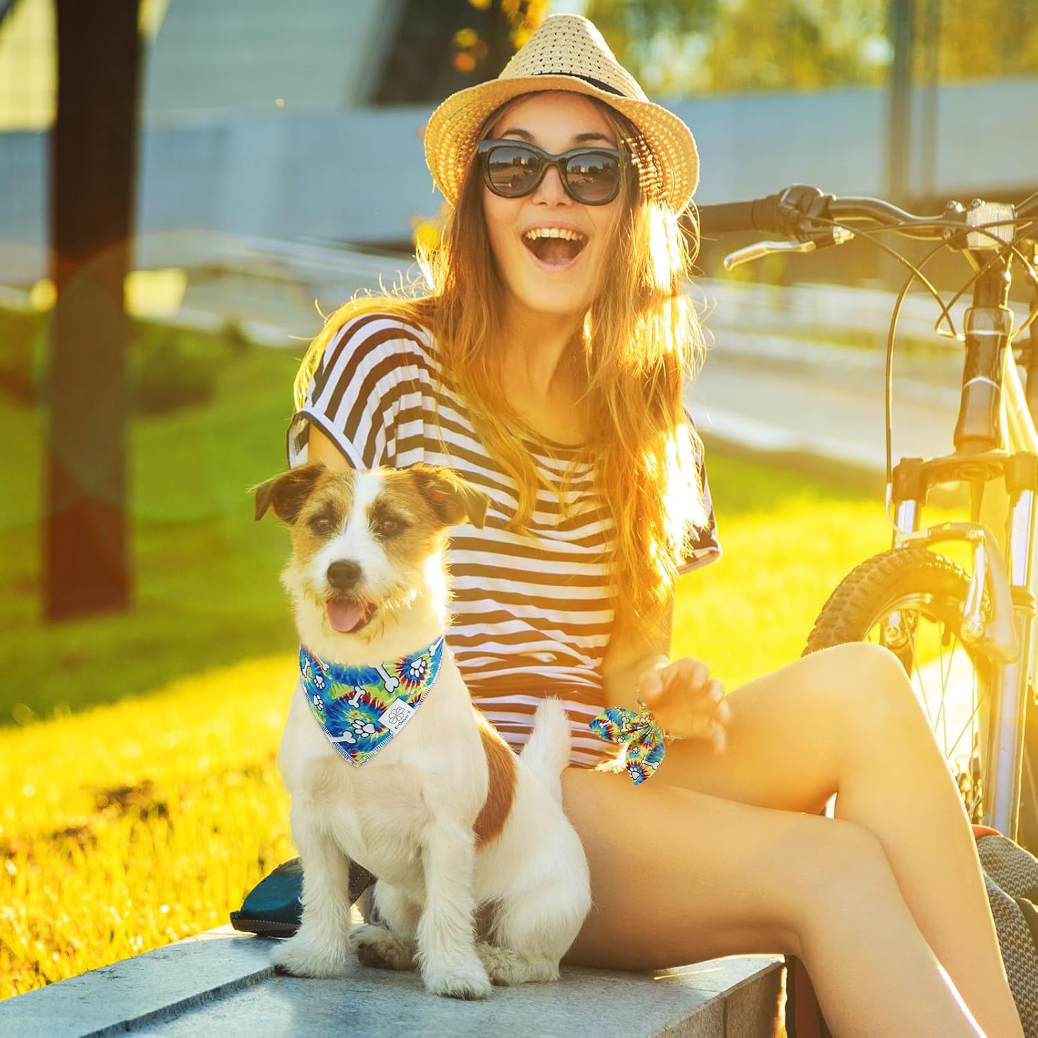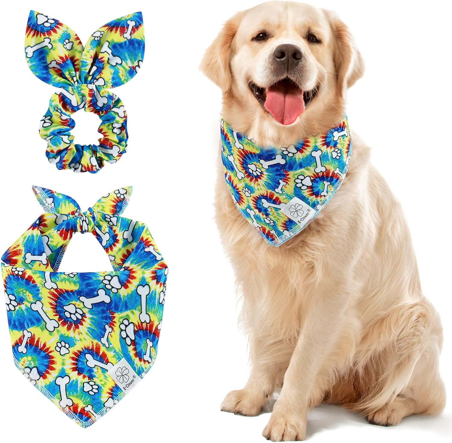 - Matching Bandana and Scrunchie Set- Itâs full of love when your pets is wearing the colorful bandanas and you are wearing the bow scrunchies. When traveling, sleeping, taking photos or daily warking, adorable dog spring bandana and scrunchie is a pretty accessories. The the hair tie can be worn as a wrist accessory and hold your hair. Beautiful dog drool bibs and scrunchie with rainbow and dog paw pattern, itâs nice photo props.