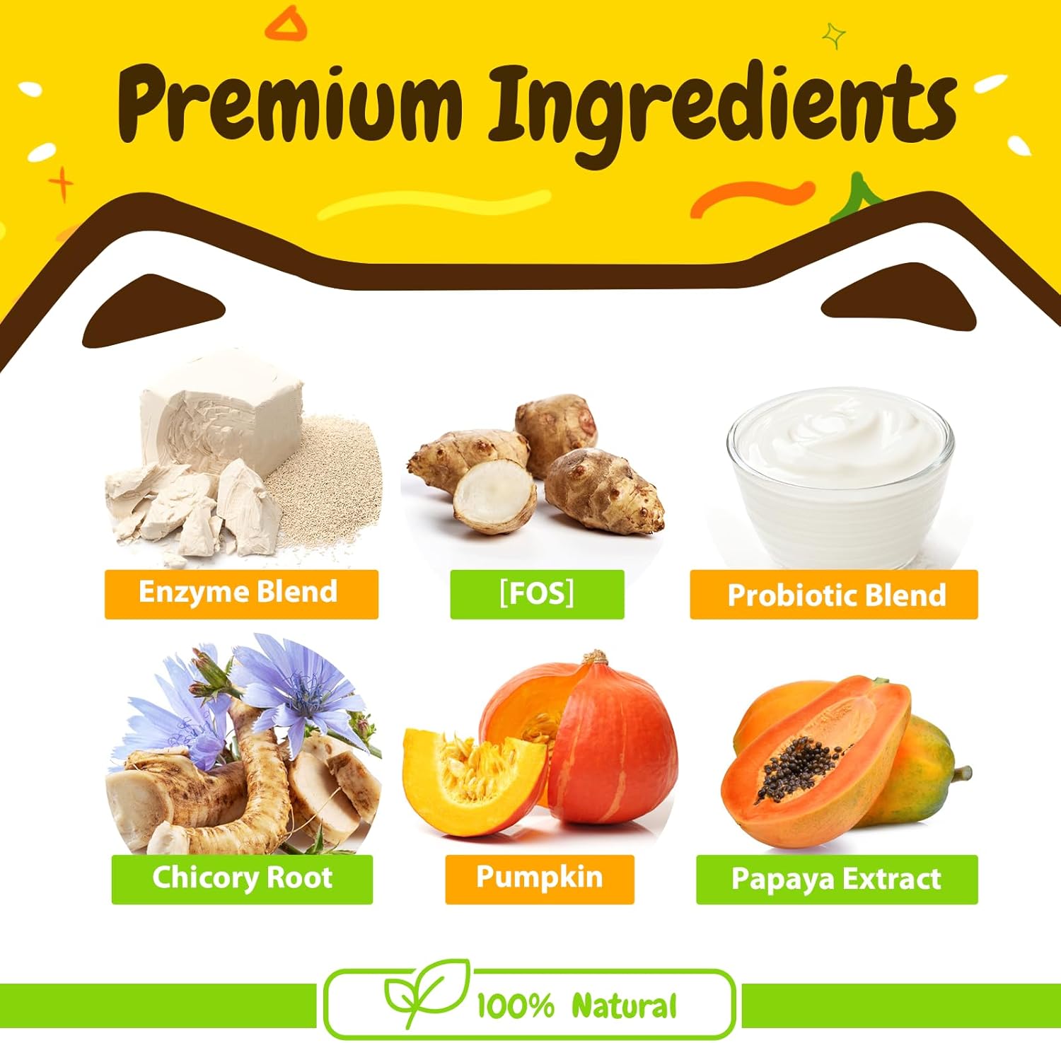 - Premium Natural Ingredients for Gentle Care: Made with non-GMO, wheat-free, and soy-free ingredients, these probiotics for dogs are gentle enough for dogs with sensitive stomachs. Digestive boosters like chicory root, FOS, and pumpkin work together to regulate digestion and support overall gut health.