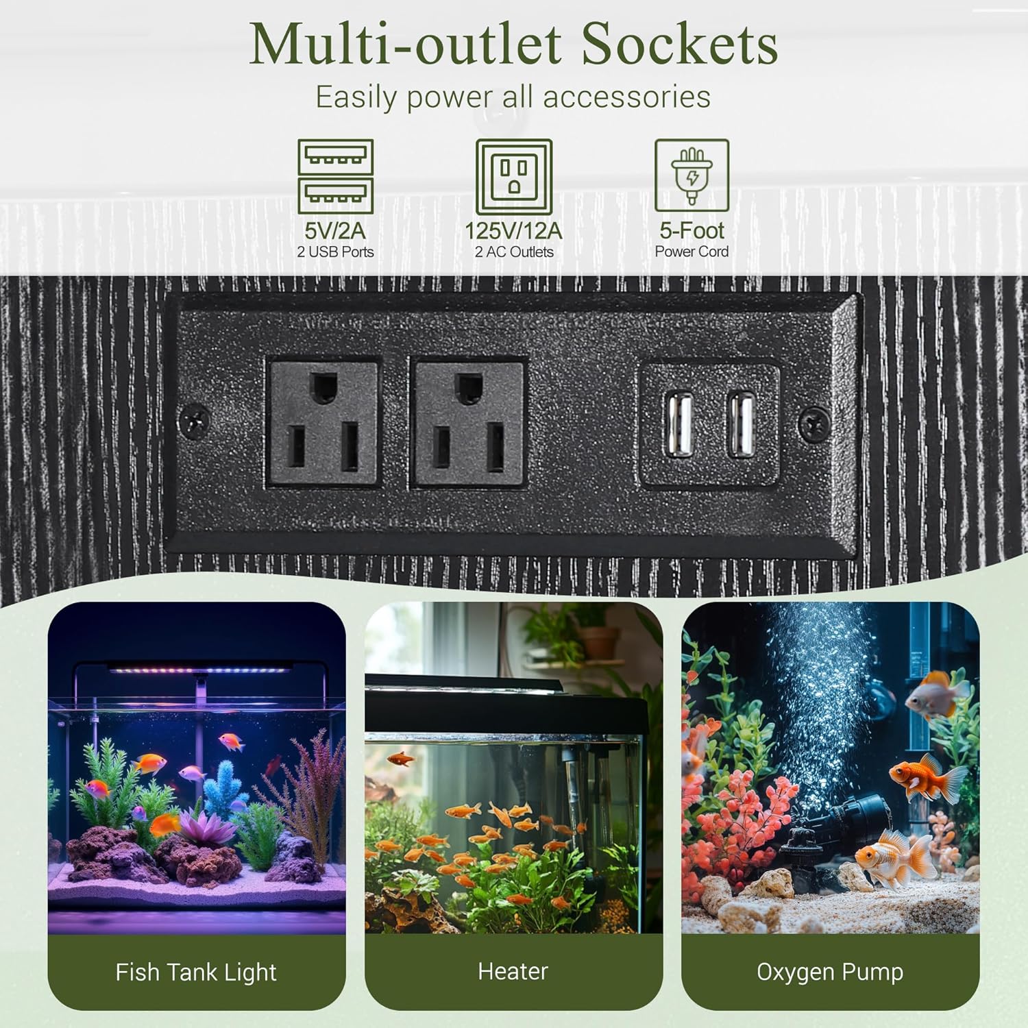 - ăBulit in Power OutletsăThe 20-29 gallon aquarium stand comes integrated with 2 AC and 2 USB outlets, optimally catering to all your aquarium & reptile device power needs