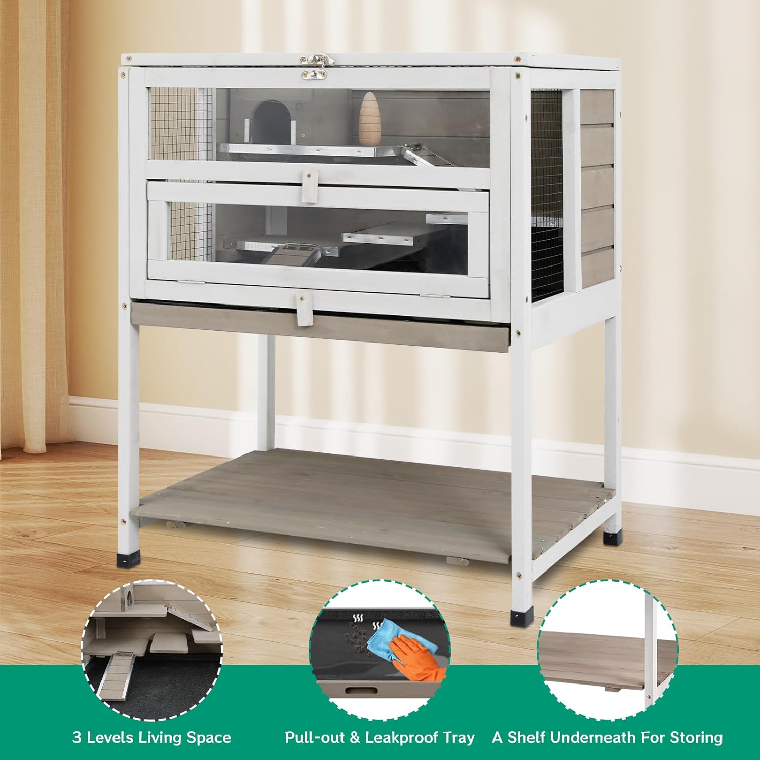 - 2-Story Guinea Pig House with Storage Legs: The first level with play area, allow pet to roam and enjoy itself freely. The second level,integrated storage shelf and stand structure,no need to place the cage on the floor or table,and enough space to put pet's essentials and food, ensuring both convenience and practicality.
