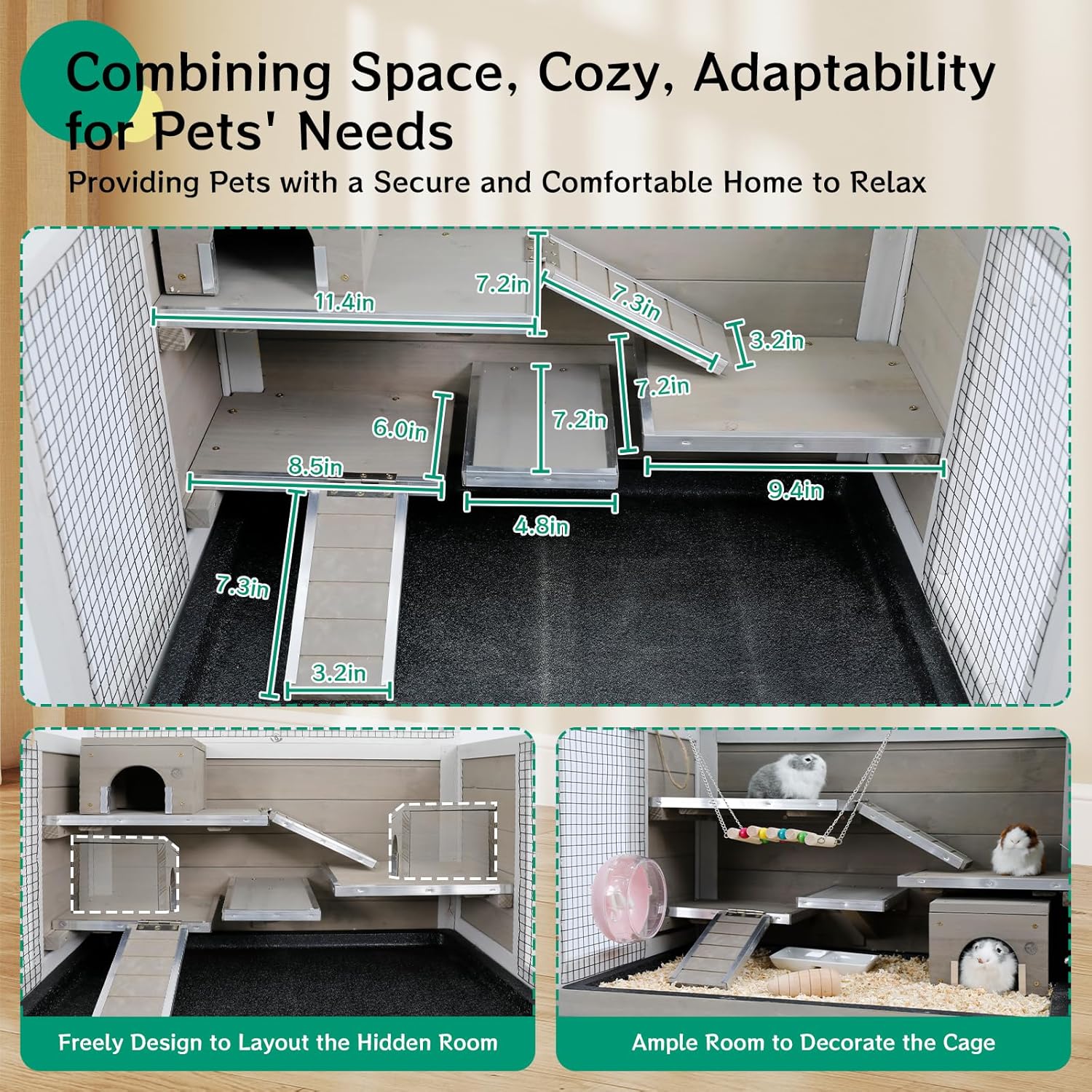 - Sturdy & Safety Guinea Pig Cage:Cage combined with the wire mesh and Wood mpanels,perfect blend of strength, ventilation, safety, this cage combination of wood and iron mesh, ensuring durability and comfortable living environment. The iron mesh, designed with 0.5"x0.5" spacing, not only guarantees the safety of your guinea pigs but also effectively prevents them from escaping.