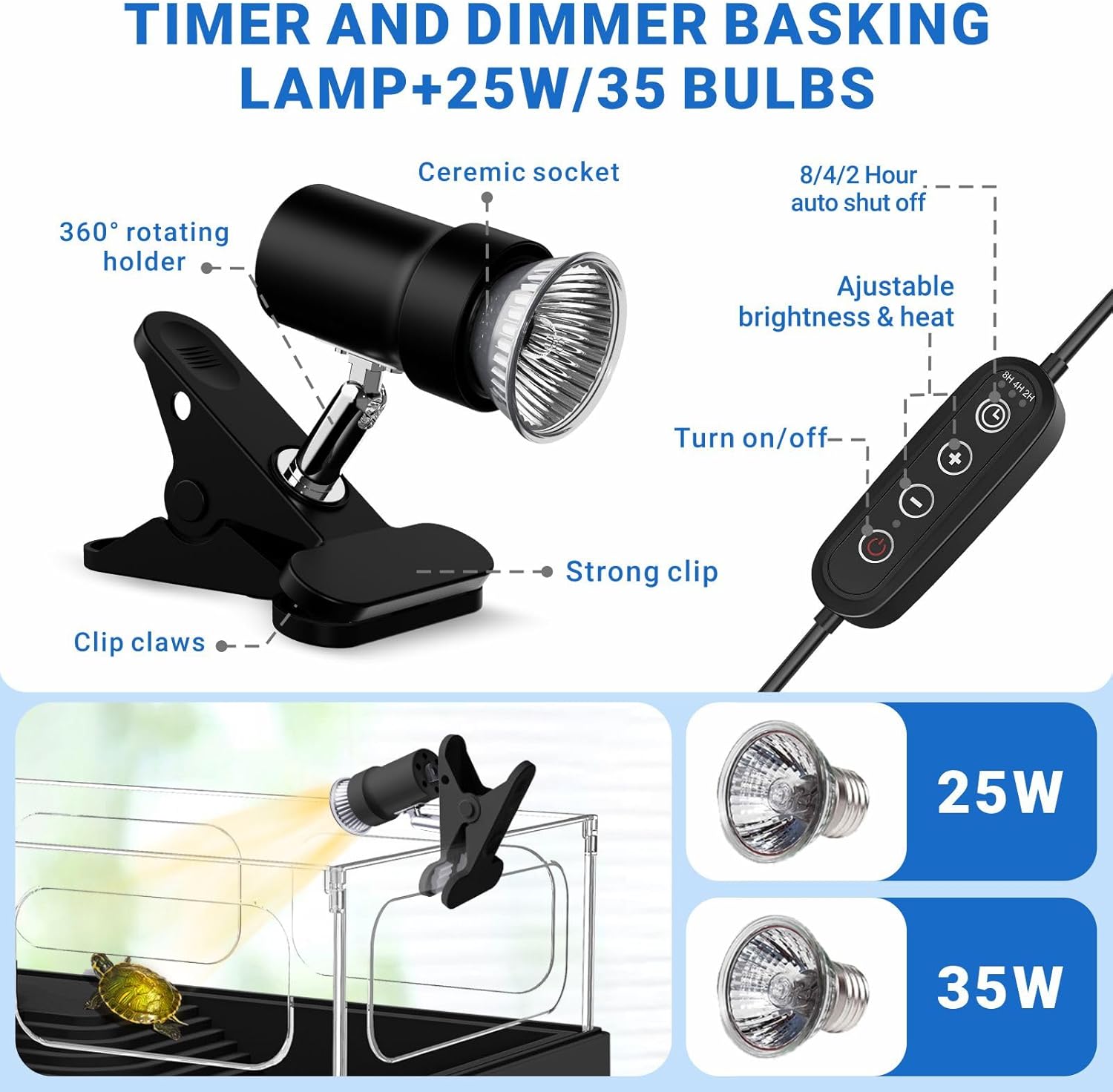 - ăADJUSTABLE UVA/UVB BASKING LAMP + 25W/35W BULBSăTurtles need 1-2 hours of sunlight per day for metabolism, mood regulation, reproduction, etc. Sunlight simulation lamp provide optimal warmth at a distance of 10" to 15". In addition to controlling the brightness, basking lamp can also be set for 2, 4 or 8 hour with auto shut-off function. Making cozy sunbath for your reptile friends.(Note:The rated voltage power is applicable to 110V-130V)