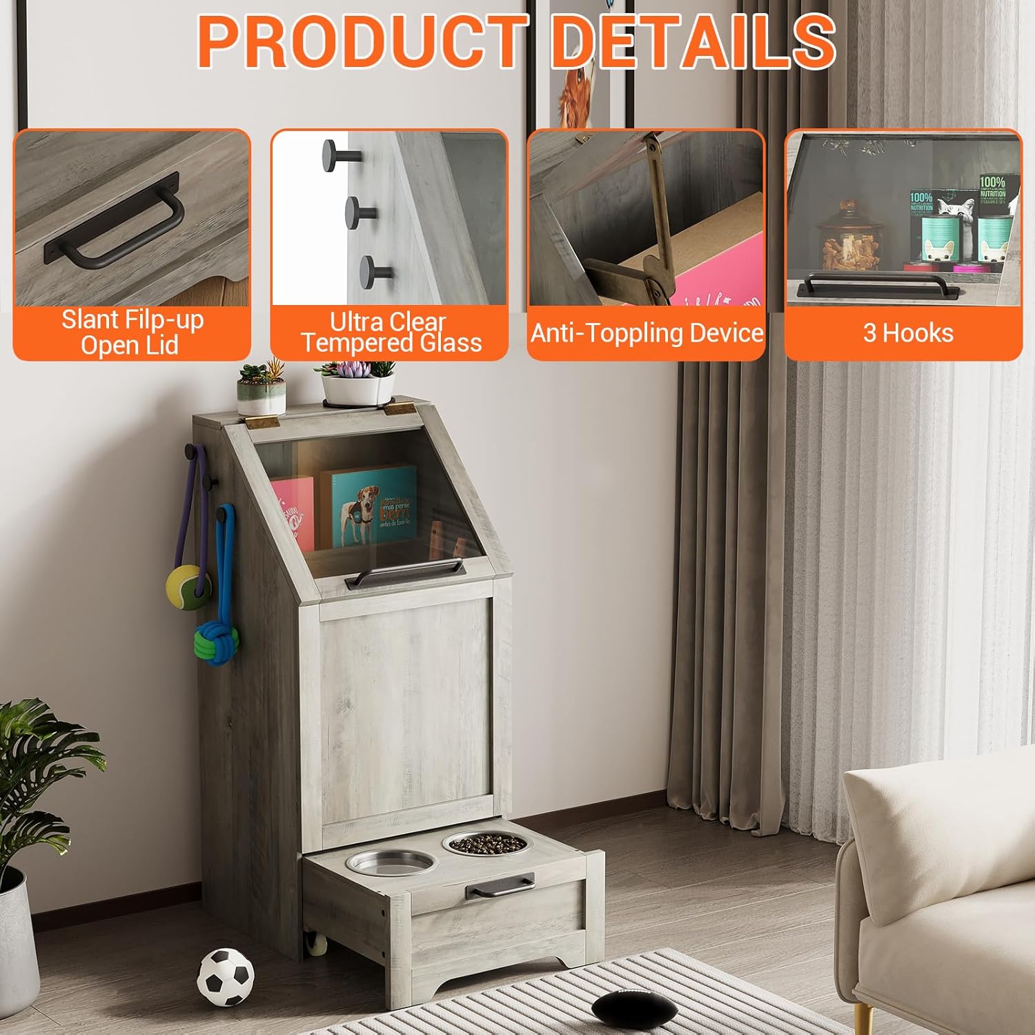 - --For Convenience: The anti-tipping tempered glass door provides easy access to your pet's food while ensuring safety. The pet feeding station also includes three hooks for leashes, collars, or accessories, adding extra functionality for pet owners