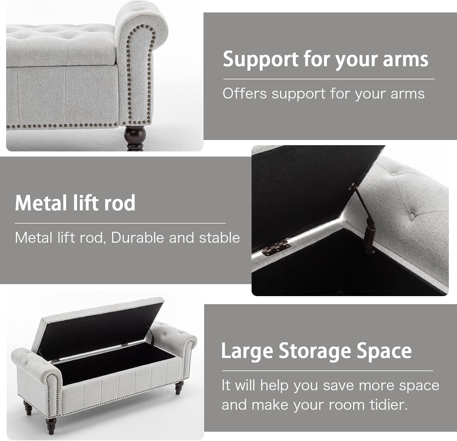 - Spacious Storage: This storage bench features a spacious hidden compartment with a safety hinge lid for smooth and secure operation. The large 43’’ x 15’’ interior offers ample room to store clothing, books, blankets, or other bedroom essentials, helping you keep your space neat and organized.