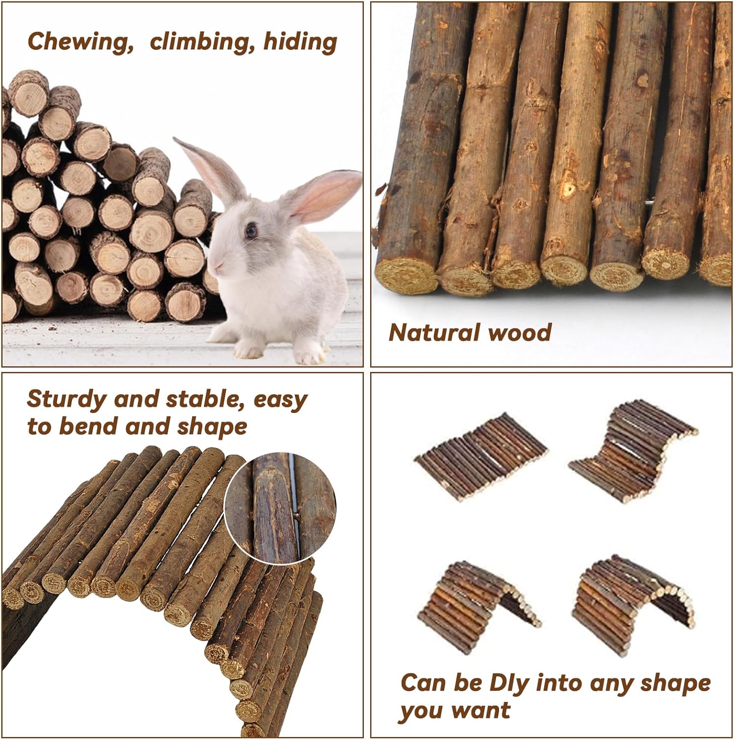 - 【Product Features】Guinea pig wooden bridge internal metal wire can be freely bent,pliable and flexible,wooden rabbit hideout can be designed into tunnels,bridges or slopes and other shapes,adding more fun for pets. And the wood rabbit hideout made of solid wood is very sturdy,durable and practical.