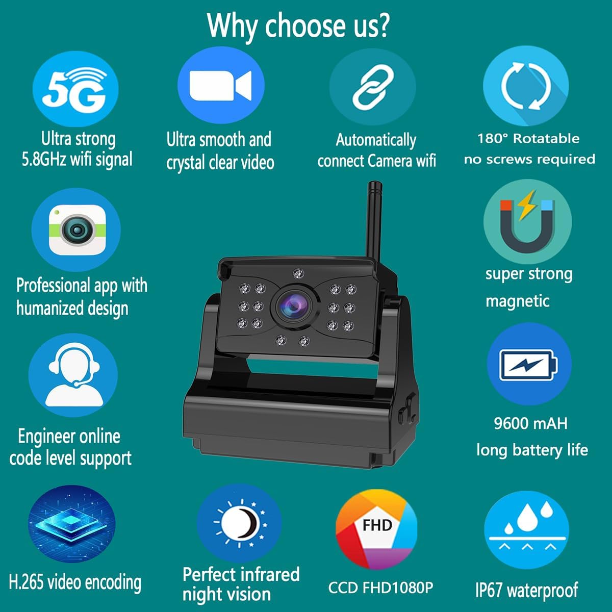 - ✅《Super Strong Wifi Signal》Unlike other trailer backup camera that use 2.4G wifi, Our trailer backup camera has built-in advanced 5G WiFi chip, with reliable anti-interference circuit design to achieve a super strong wifi signal, the stable transmission distance up to 150ft in open area