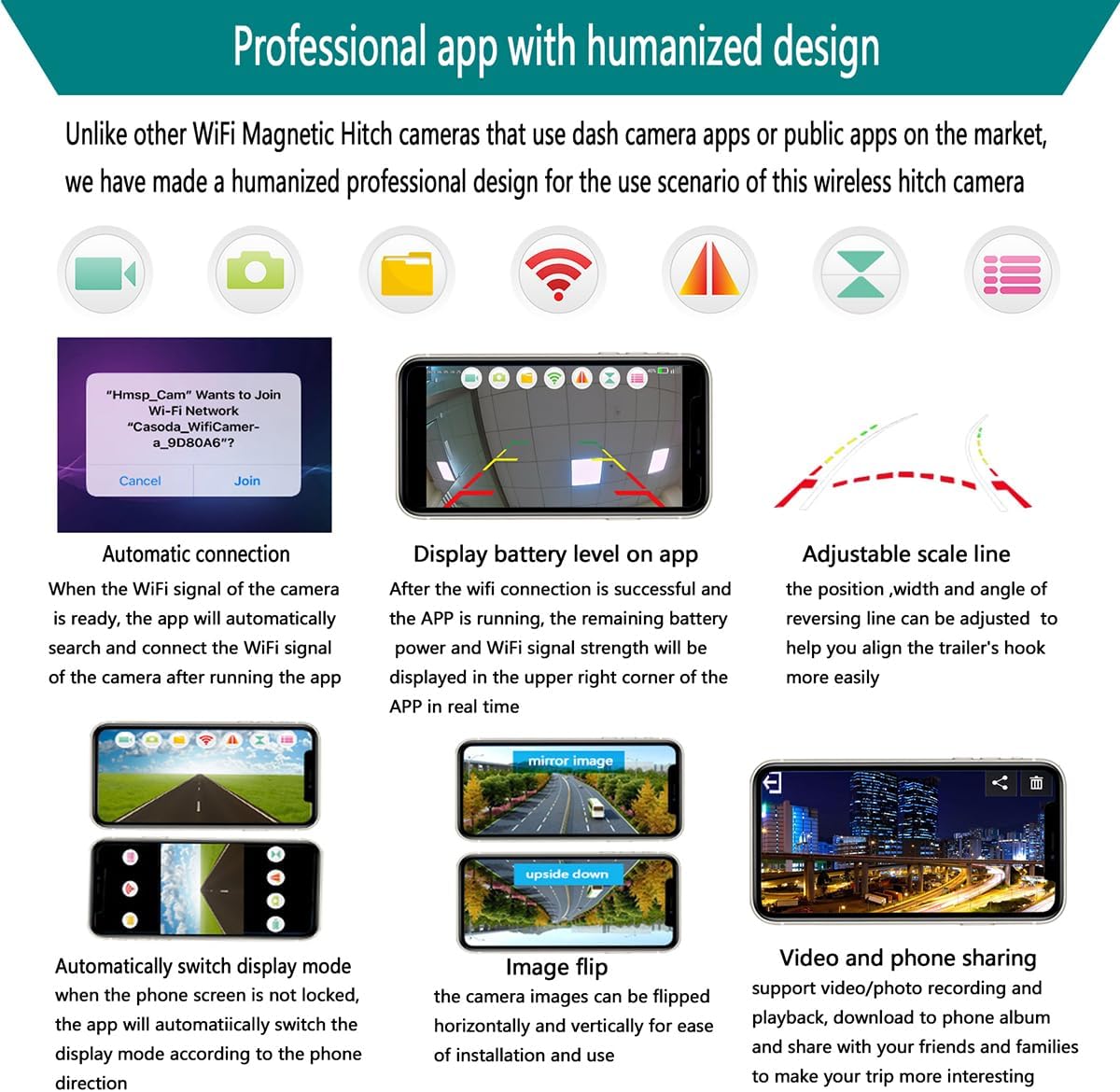 - ✅《Professional app with humanized design》Unlike other trailer camera that use dash camera apps or public apps on the market, we have made a humanized professional design for the use scenario of this magnetic backup camera, For example, We have added features such as wifi automatic connection, real-time display of battery power, automatic switching of display mode, and adjustable reversing scale line etc.