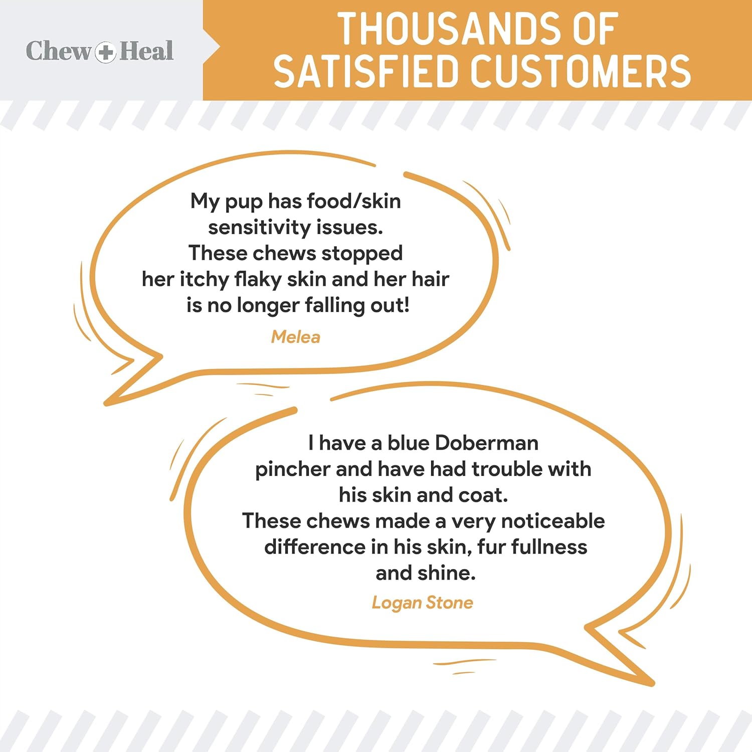 - PREVENTS SKIN ALLERGIES: This anti itch for dogs not only softens the skin, it gives it a glossy shine and helps prevent allergic reactions. This reduces dandruff and itchy skin, helping make your dog feel more comfortable in addition to being healthier! Say goodbye to greasy or dirty coats that have a unpleasant oily smell. These dog bites help kick-start the bodyâs natural processes to improve fur health.