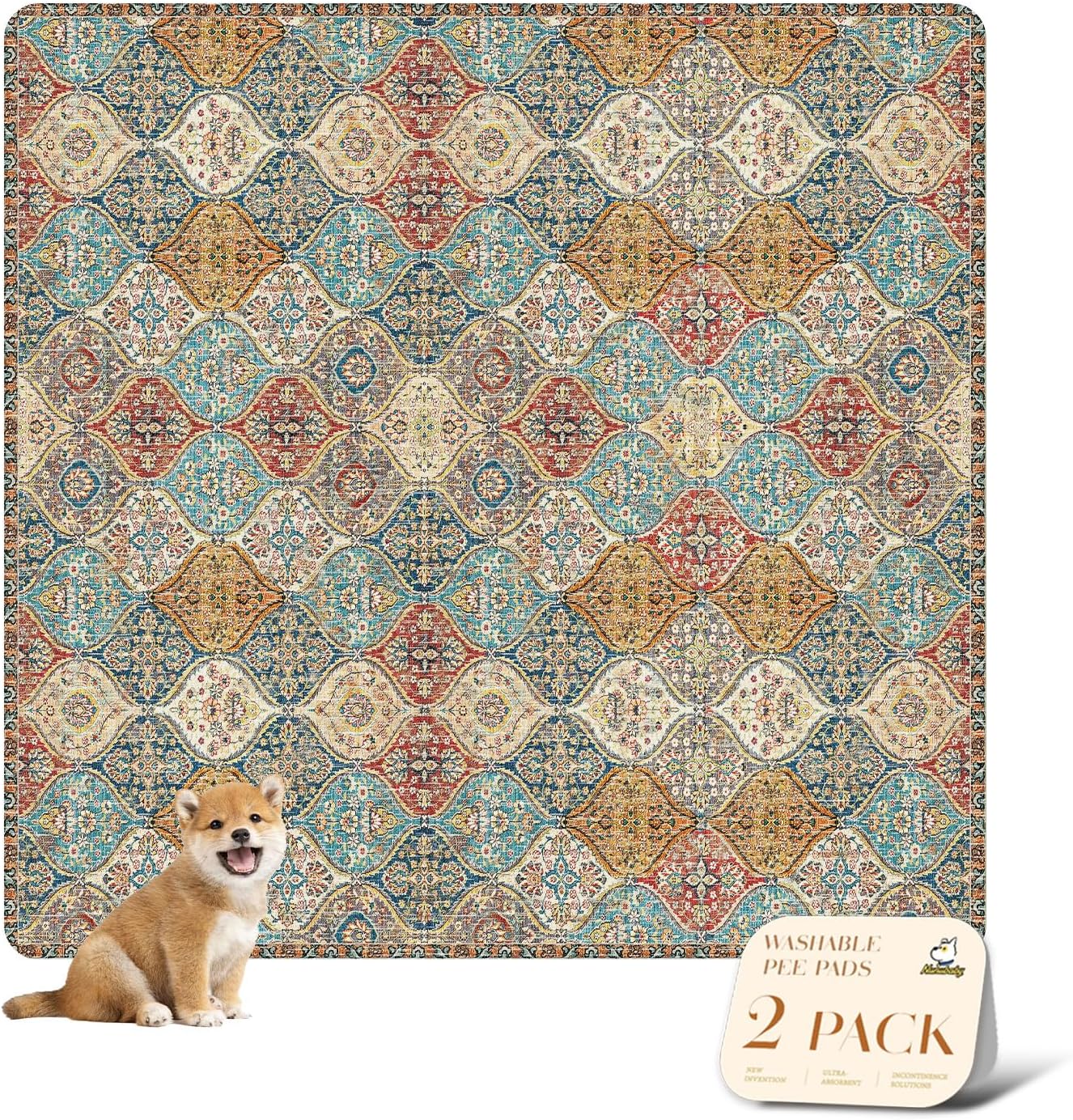 nunubaby 2PACK Washable Pee Pads for Dogs, Stylish, Non-Slip and Leak-Proof Pee Pads. Reusable Potty Pads for Dogs for Crates and Floors.(Cream/Multi, 72" x72")