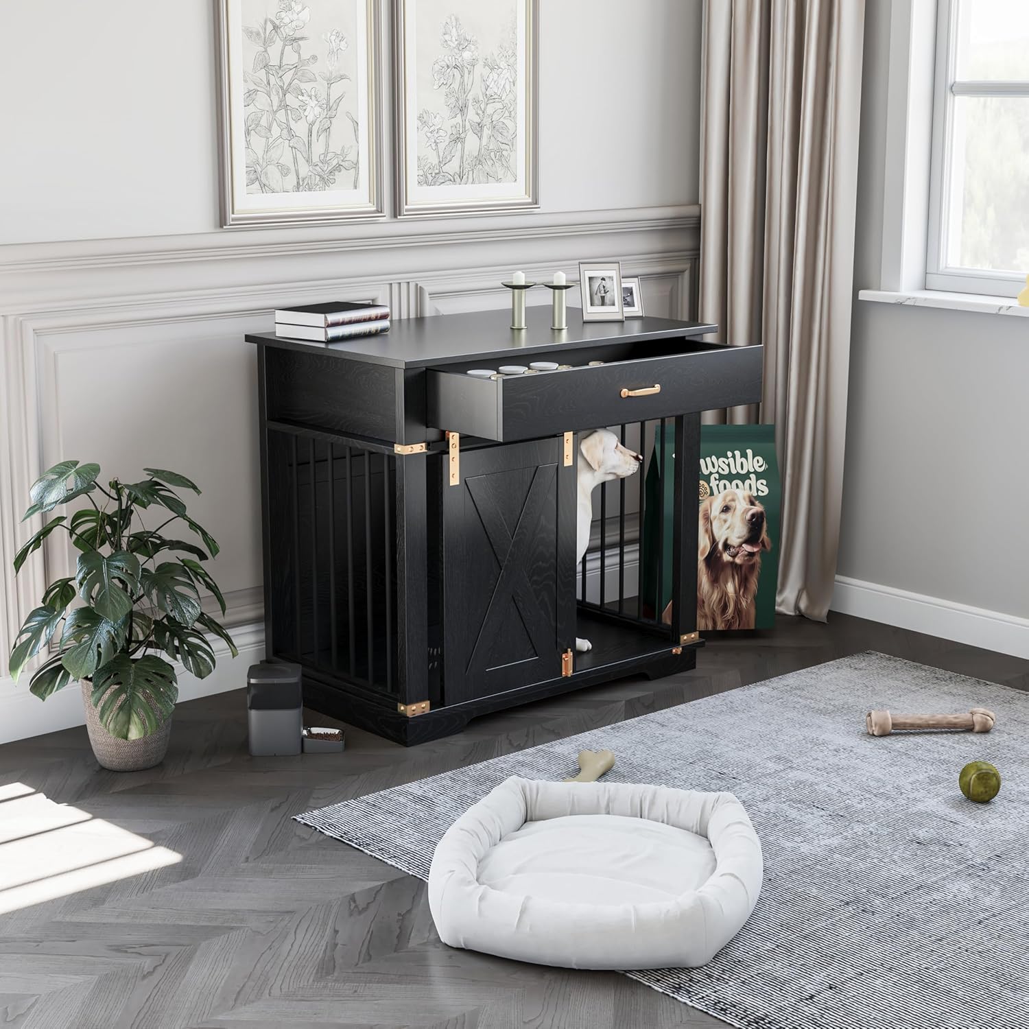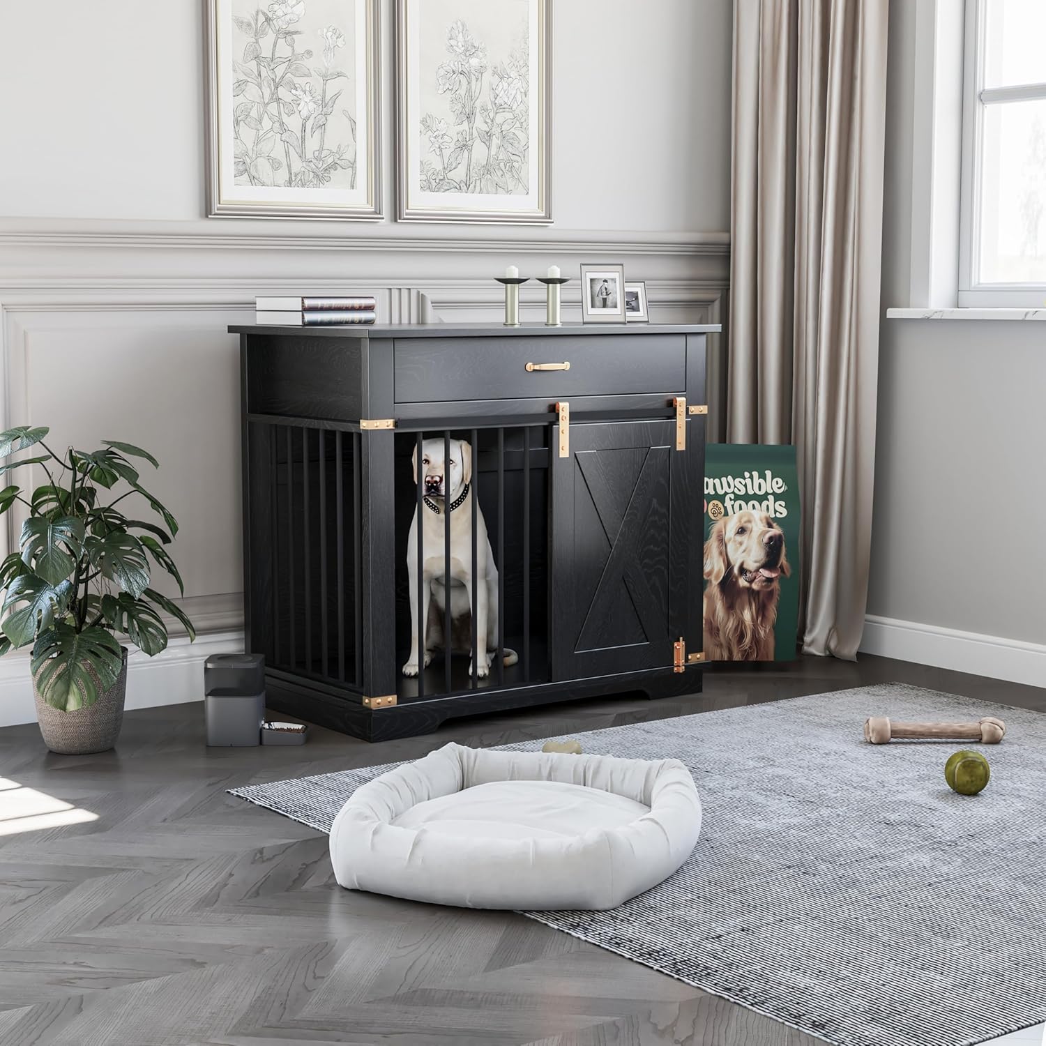 - Convenient Storage & Space-Saving Design: Equipped with a practical drawer storage area, this dog crate helps you organize your petâs toys, food, and essentials neatly. The sliding barn door design ensures easy access while saving space, making it a perfect fit for any room.