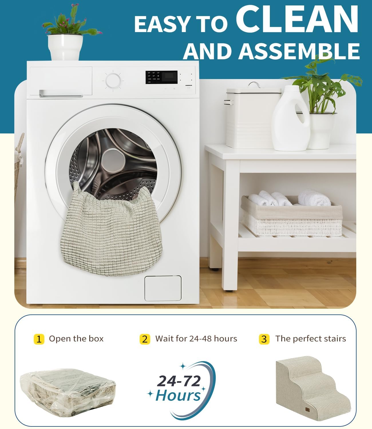 - Easy to Clean - The dog stairs feature a removable, machine washable cover for effortless cleaning. Using without assemble, our pet stairs provide a safe and convenient way for your furry friend to access higher surfaces without the risk of injury or strain on their joints.