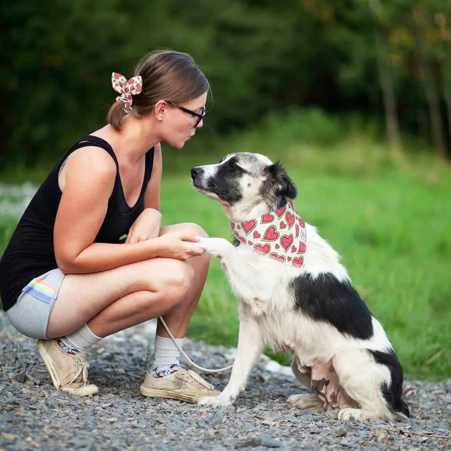 - Dog Bandanas Girl Size: 26x16.5x16.5inchs (66cm *42cm *42cm).The adjustable cute dog bandanas fit pet neck size up to 18.9inchs (48cm).You can roll the dog bibs a couple of times to fit your dog if itâs too large. Please measure your dogâs neck before buying.Pink heart scrunchies is one size fits all.
