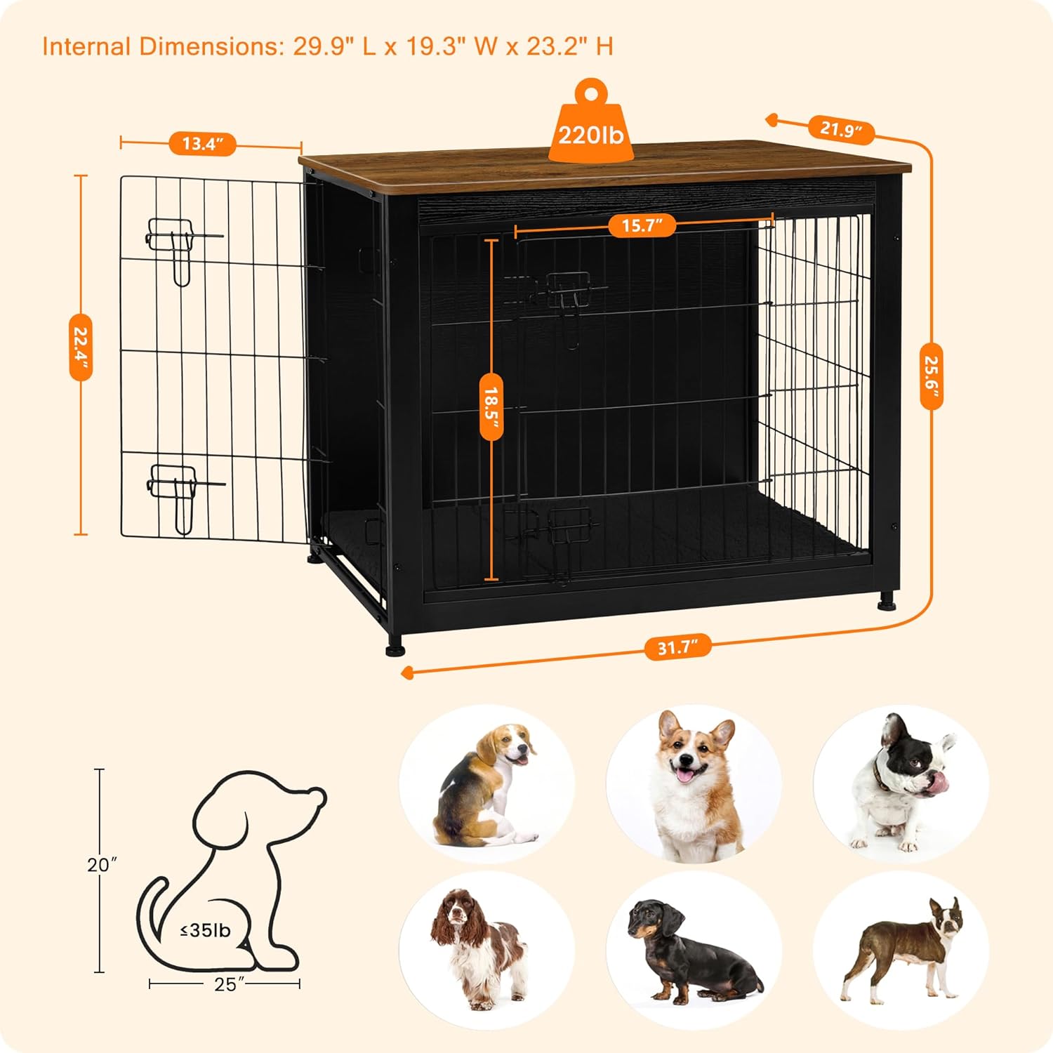 DWANTON Dog Crate Furniture with Cushion, Wooden Kennel Table with Double Doors, Indoor Dog House, Medium Size, 32.5" L, Black+Warm Brown