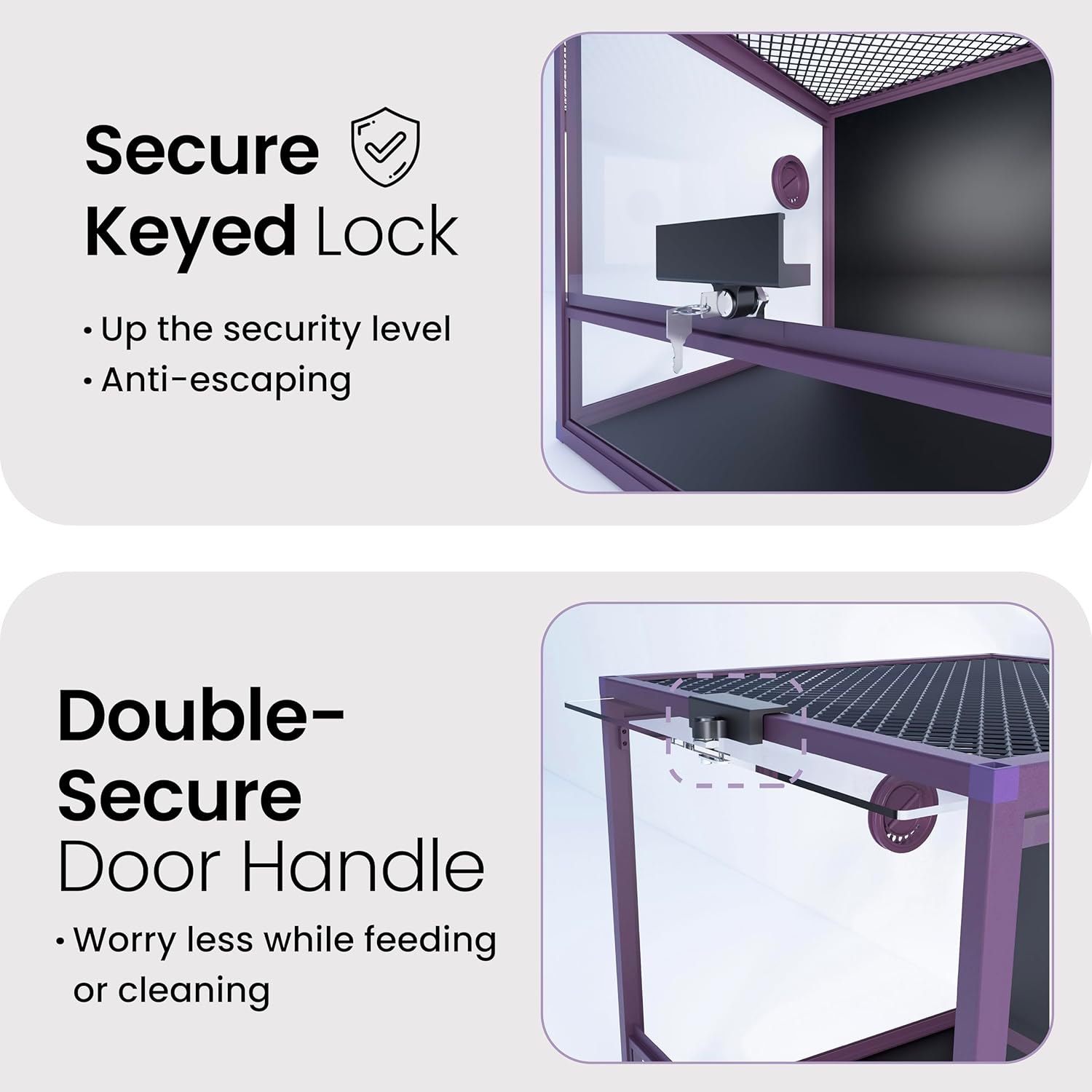 - ăLock IncludedăA tempered glass door with a safety keyed lock to prevent escape and accidental opening by others. NO GAPS FOR ESCAPING with fully closed structure. Rigid tempered glass doors for extra safety.