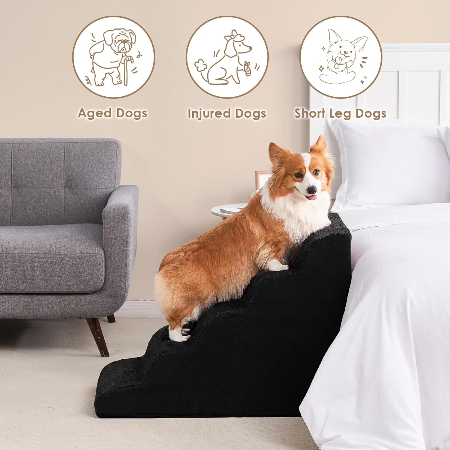 - COMFORTABLE PET STAIRS - This foam dog stair is designed directly against the edge of a bed, sofa or other furniture, so your pet can climb up and down comfortably.