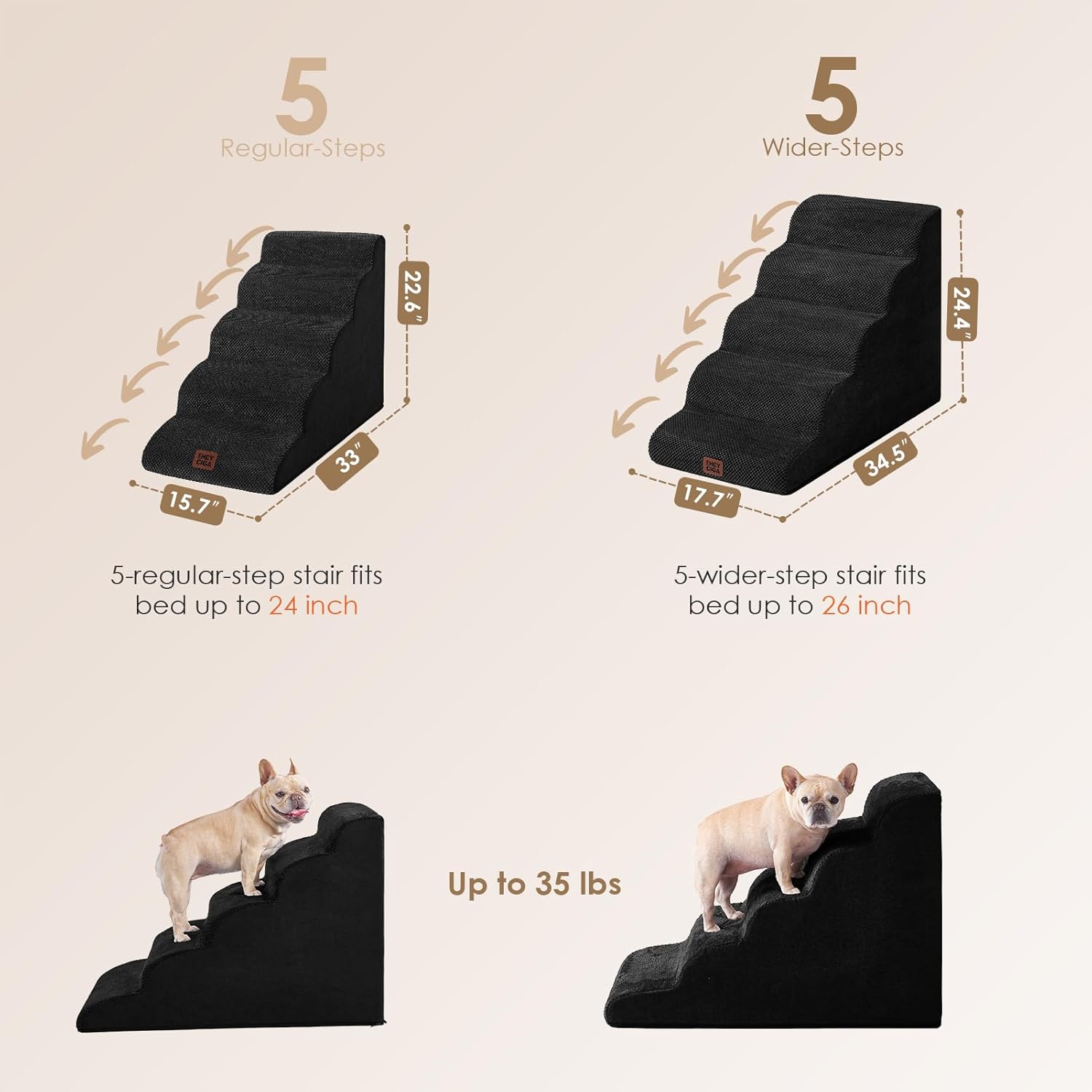 - MULTIPLE STEP SIZES - This dog stair has 2 steps, 3 steps, 4 steps and 5 steps to choose. Our 2-step stairs fits for chair/sofa/bed up to 13inch. 3-step stairs fits for chair/sofa/bed up to 17inch. 4-step stairs fits for chair/sofa/bed up to 21inch. And 5-step stairs fits for chair/sofa/bed up to 24inch.