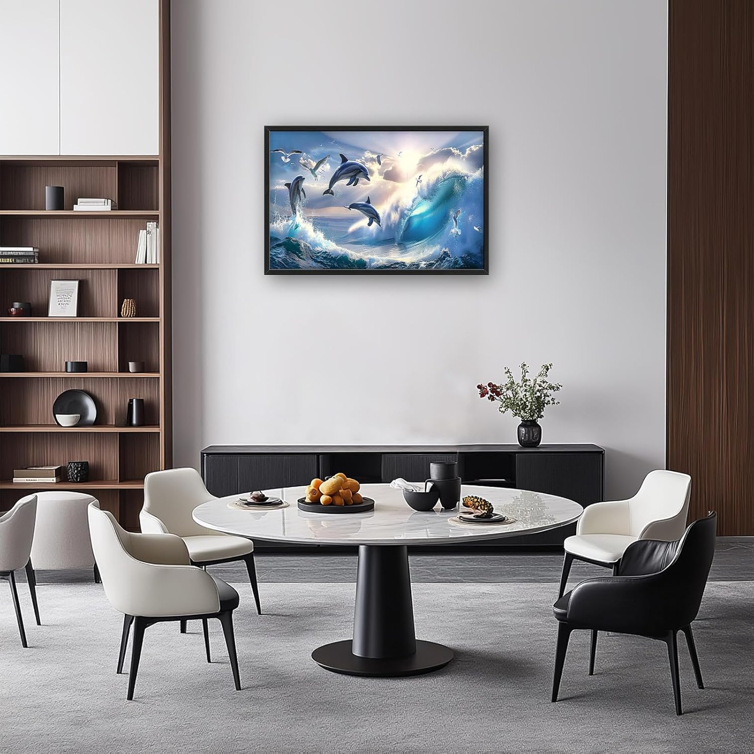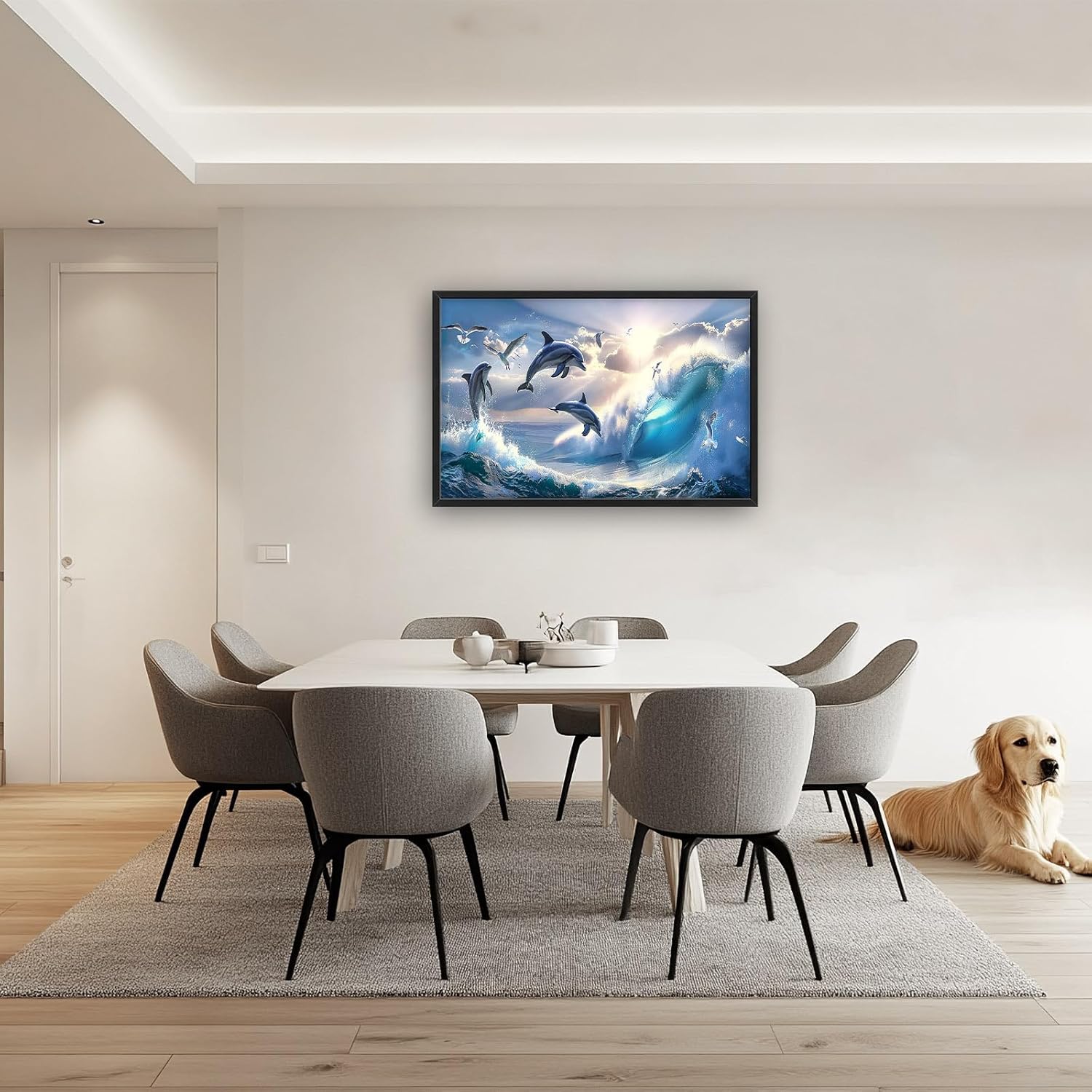 - 【Unique Design】A majestic ocean scene with graceful dolphins leaping out of the water, surrounded by glistening waves and seagulls soaring in the sky, in the style of 3D Realistic.