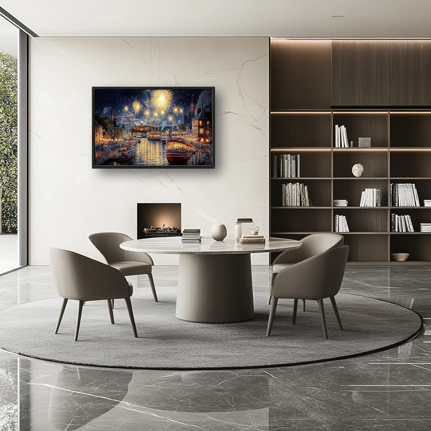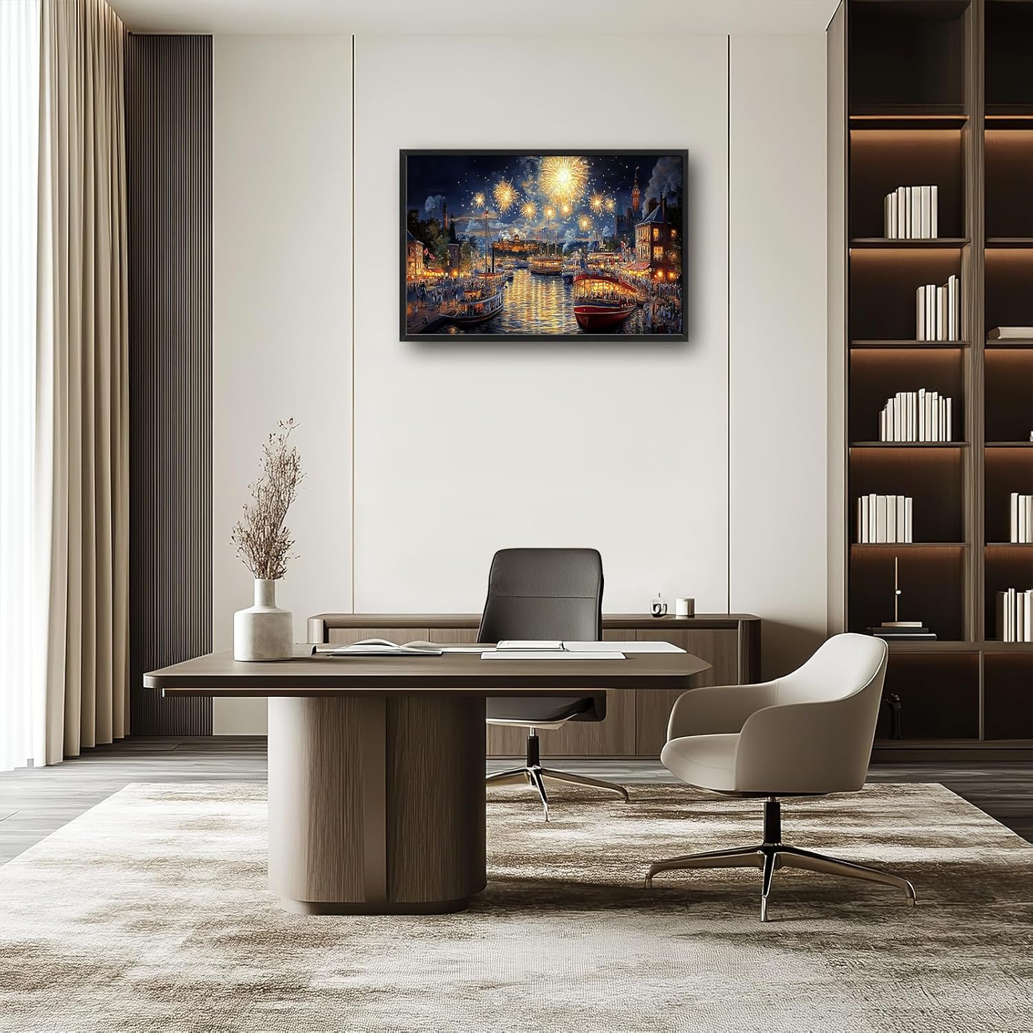 Framed Large Firework Night Sky Wall Art, Oversized European City Landscape Wall Decor for Living Room, River Boats Canvas Pictures Home Decoration for Living Room Bedroom Office 36"x24"