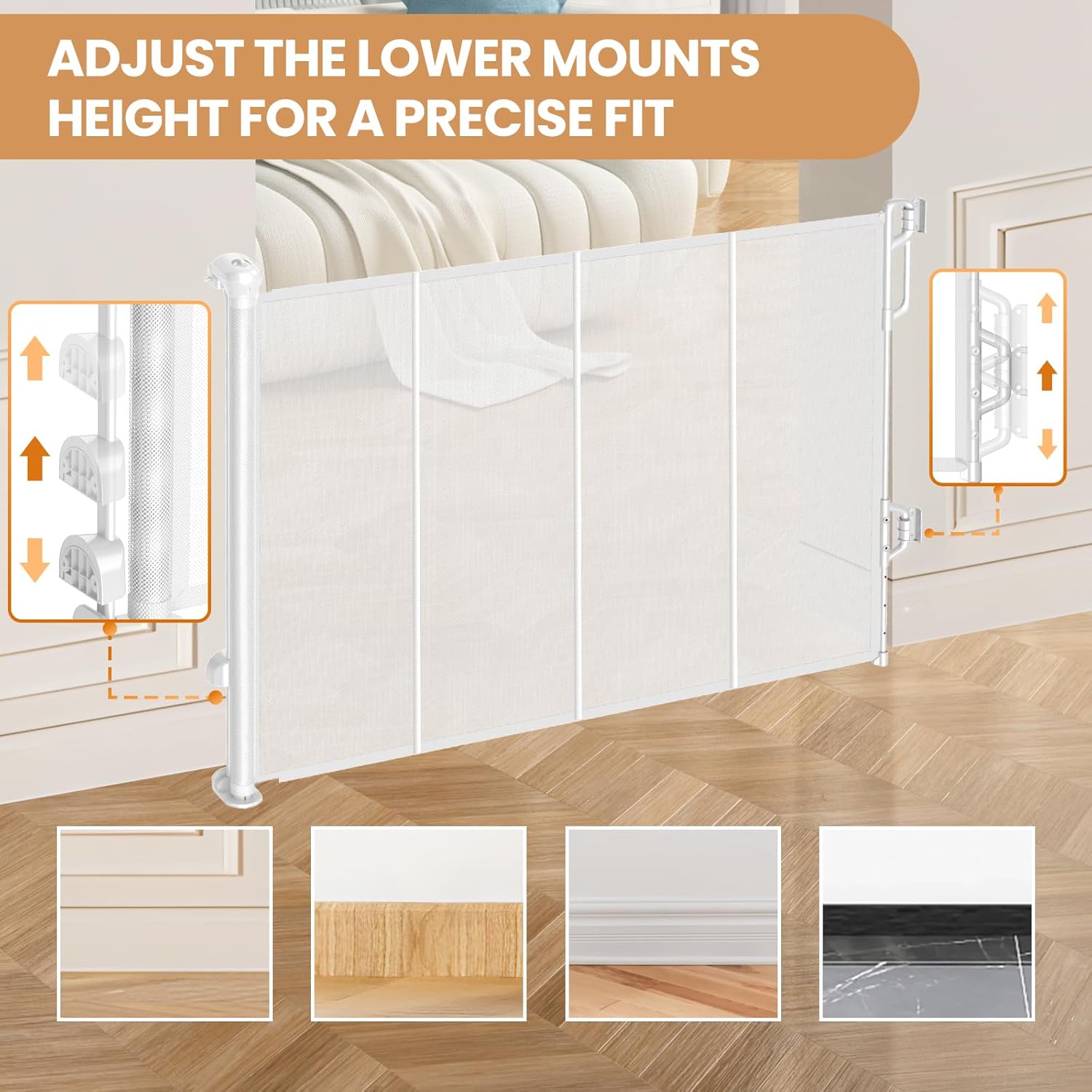 - 【Reinforced Safety Upgrade】 <1>The upgraded reinforced Retractable Baby Gates has three reinforced rods. Stronger and less prone to deformation. Prevent the top grid from sagging, deforming, and the bottom from lifting. Prevent babies and pets from crawling under gates. <2>Retractable baby gate featured with double locking mechanism creates a safety home for your curious crawlers and keep them away from danger, providing a safe, closed off environment to play.
