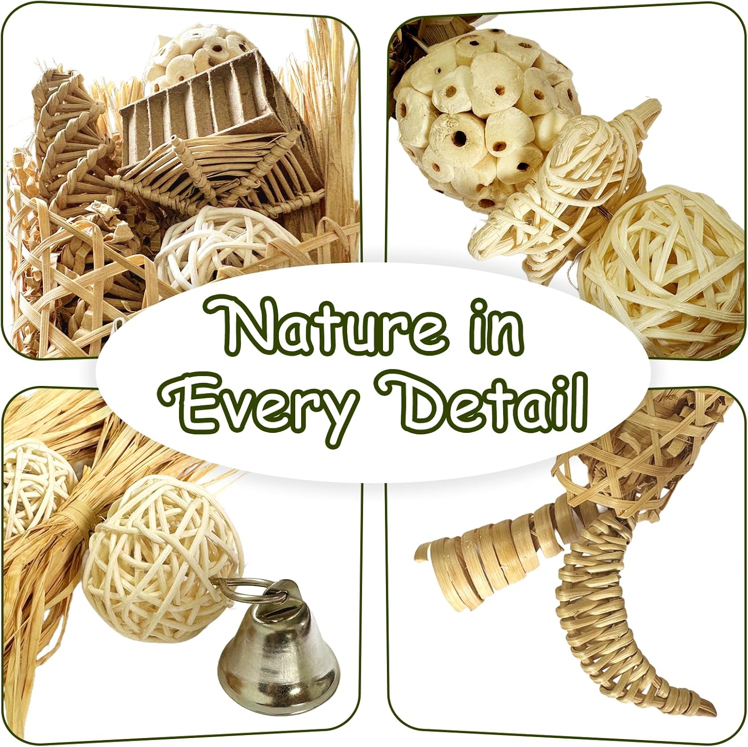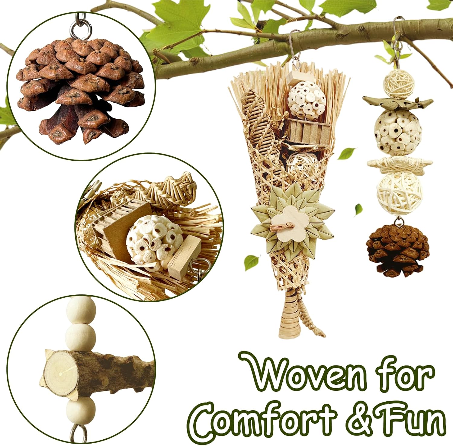 - All-Natural Materials, No Plastic or Dye: Crafted from bamboo, rattan balls, wooden beads, prickly ash wood, sola balls, pine cone, rattan column, and corn husk, this set of natural bird toys offers a safe and engaging chewing experience. No harmful chemicals—just pure nature for your bird's beak.