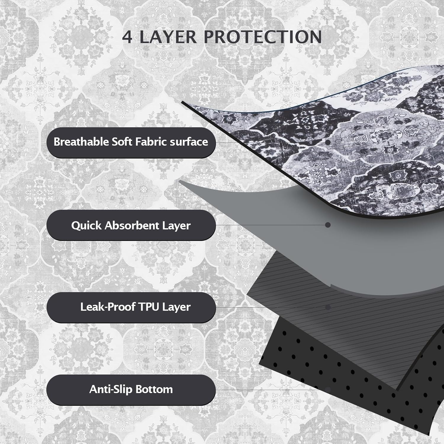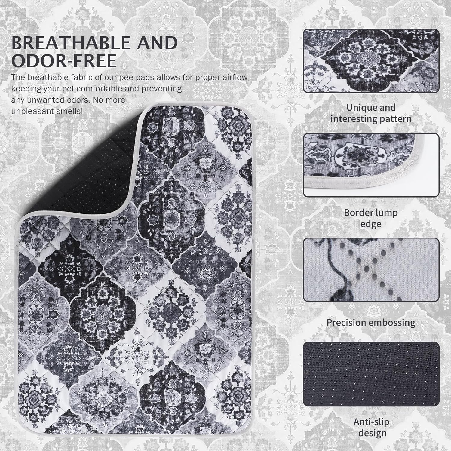 - 【Fashionable and Non-Slip】Our bohemian-print design adds a natural touch to the potty pads for dogs, giving your room a warm, casual vibe. And the non-slip bottom design makes the pet pee pads can achieve a certain fixed effect, you can put it anywhere you want. Soft and non-slip material makes it safer for dogs to use the pads.