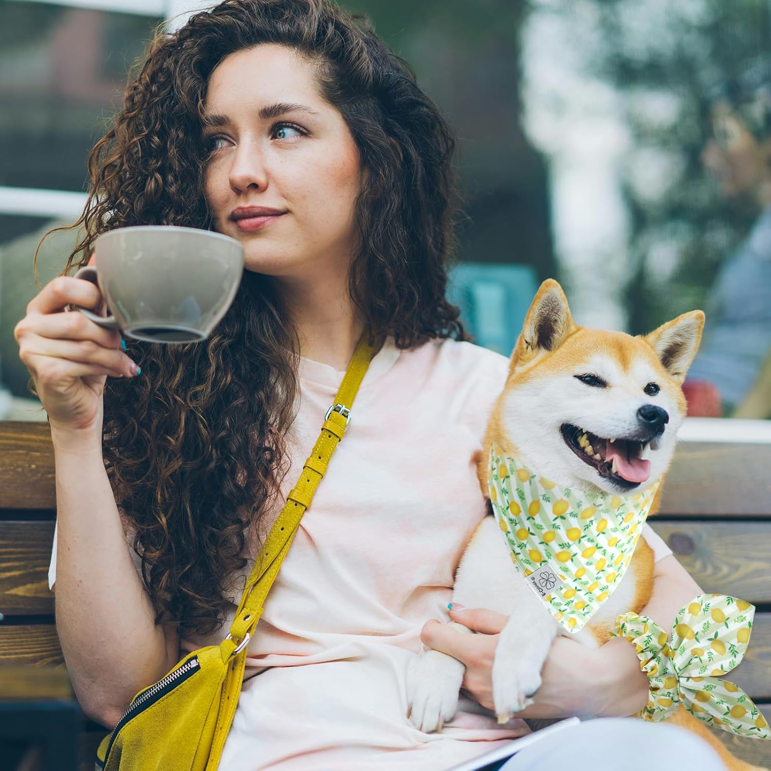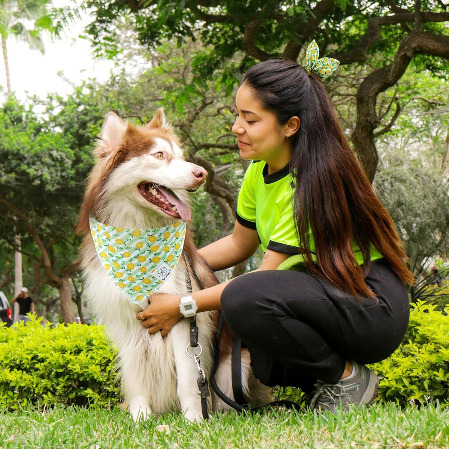 - Matching Bandana and Scrunchie Set: Itâs full of love when your pets is wearing the summer theme bandanas and you are wearing the bow scrunchies. When traveling, sleeping, taking photos or daily warking, adorable dog bandana and scrunchie is a pretty accessories. The the hair tie can be worn as a wrist accessory and hold your hair. Beautiful dog drool bibs and scrunchie with lemon pattern, itâs nice photo props.