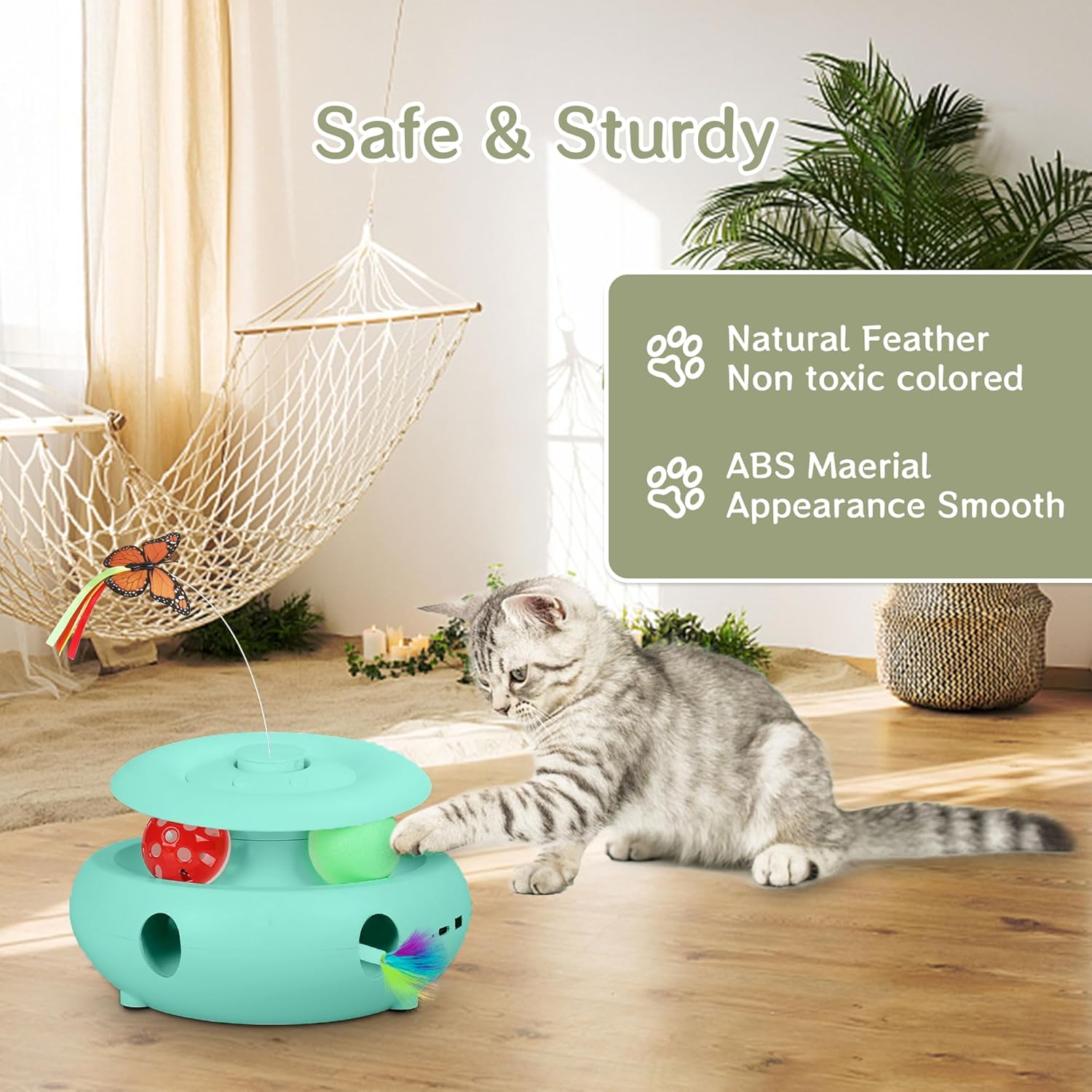 - 3 in 1cat toys: Includes three of the cat's favorite games, randomly launched feathers from 6 holes, simulated flying butterflies, and balls in the track, to attract the cat's attention and allow the cat to experience hunting, chasing, and ambushing