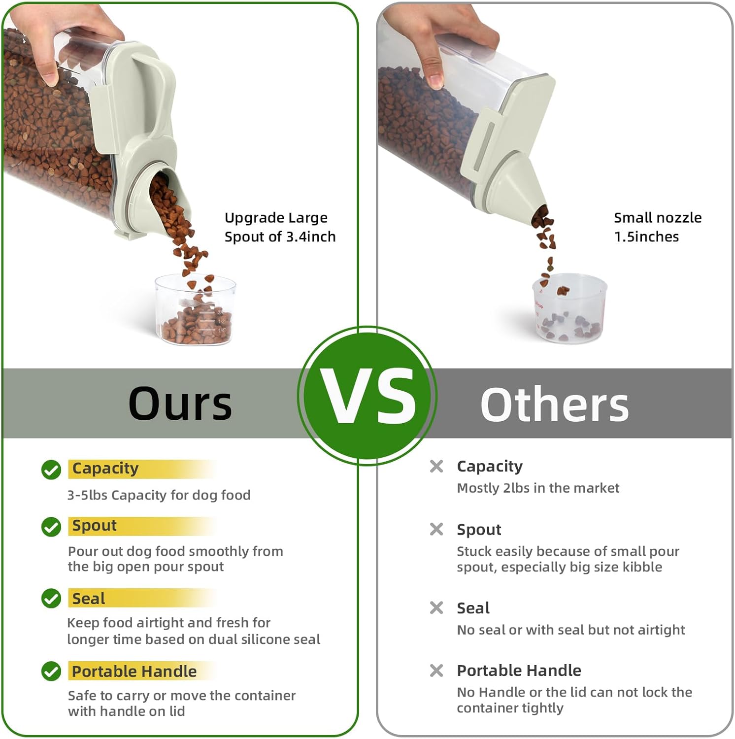 - BENEFITS : Upgraded Large Pour Spout with Measuring Cup-We upgraded the mold so that the pour spout is large enough to pour out large dog food.You can now pour food easily and quickly.The newly upgraded measuring cup can now also be easily screwed onto the nozzle