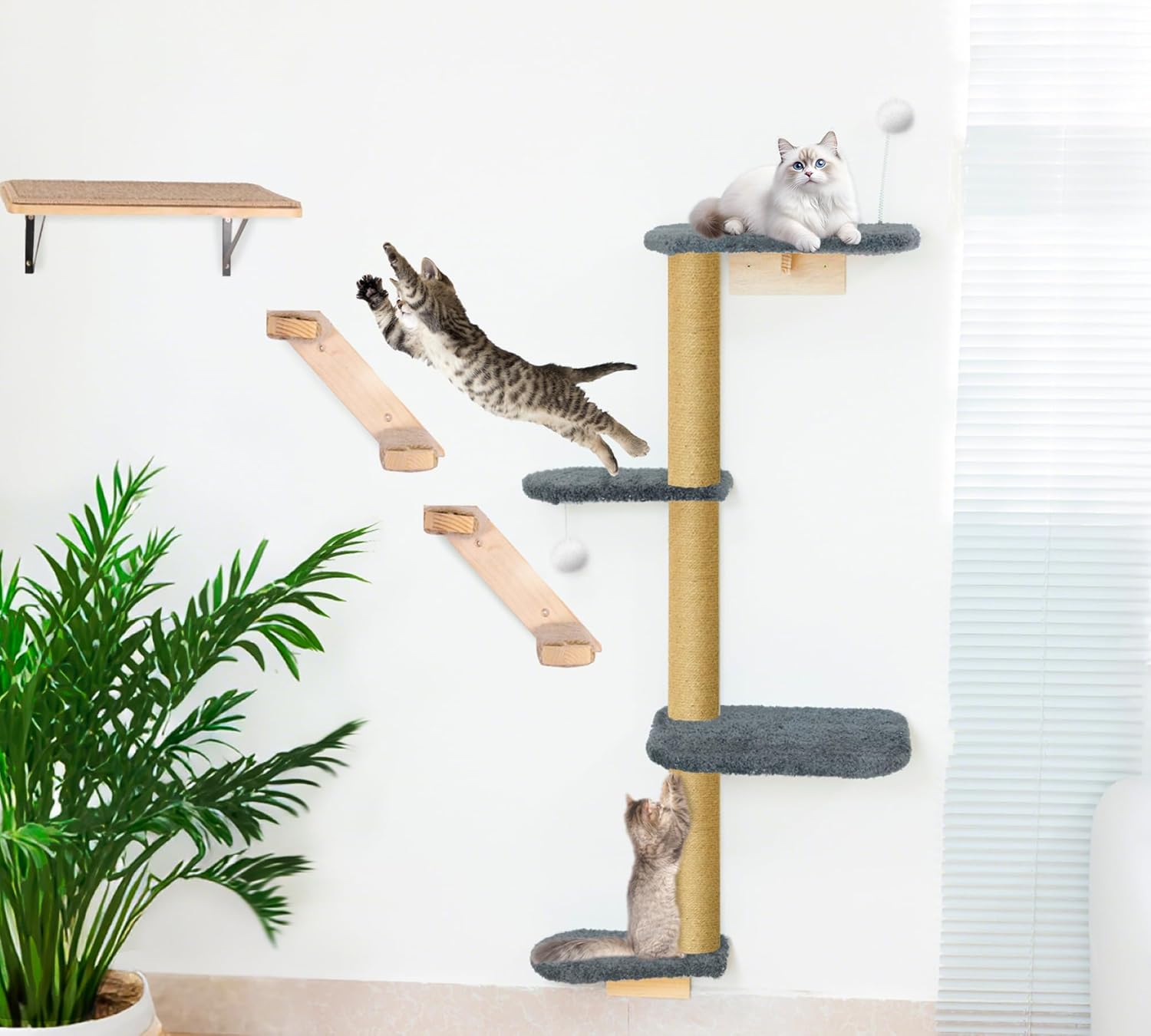- Fun and Functional Cat Wall Shelves for Kittens: This 4-tier wall mounted cat tree includes 3 climbing posts, 4 staggered platforms, and 2 engaging toysâperfect for cats under 30lbs. It encourages natural climbing, leaping, and scratching behaviors in young or active cats, while giving them cozy spots to rest. Wall-mounted to create a sky playground in your home.