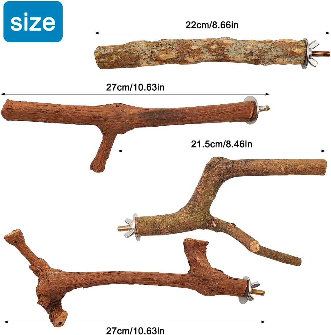 - The taste of nature: Bird perches are made of natural wood, and the natural atmosphere is rich, in line with the habits of birds. It can provide a safe and natural standing point for your bird, and each type of perch is unique in shape and size.
