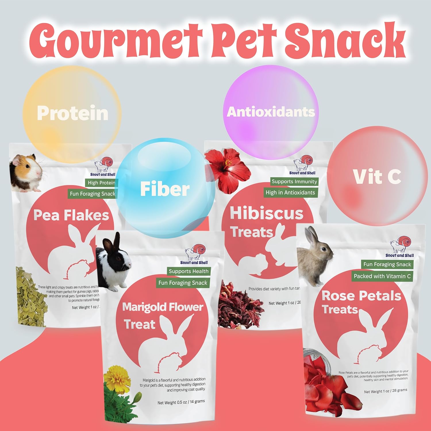 - 4-in-1 Natural Treat Variety – Includes Pea Flakes, Marigold, Rose Petals, and Hibiscus for a nutritious and enriching snack mix your small pet will love. Great for rabbits, guinea pigs, chinchillas & more.