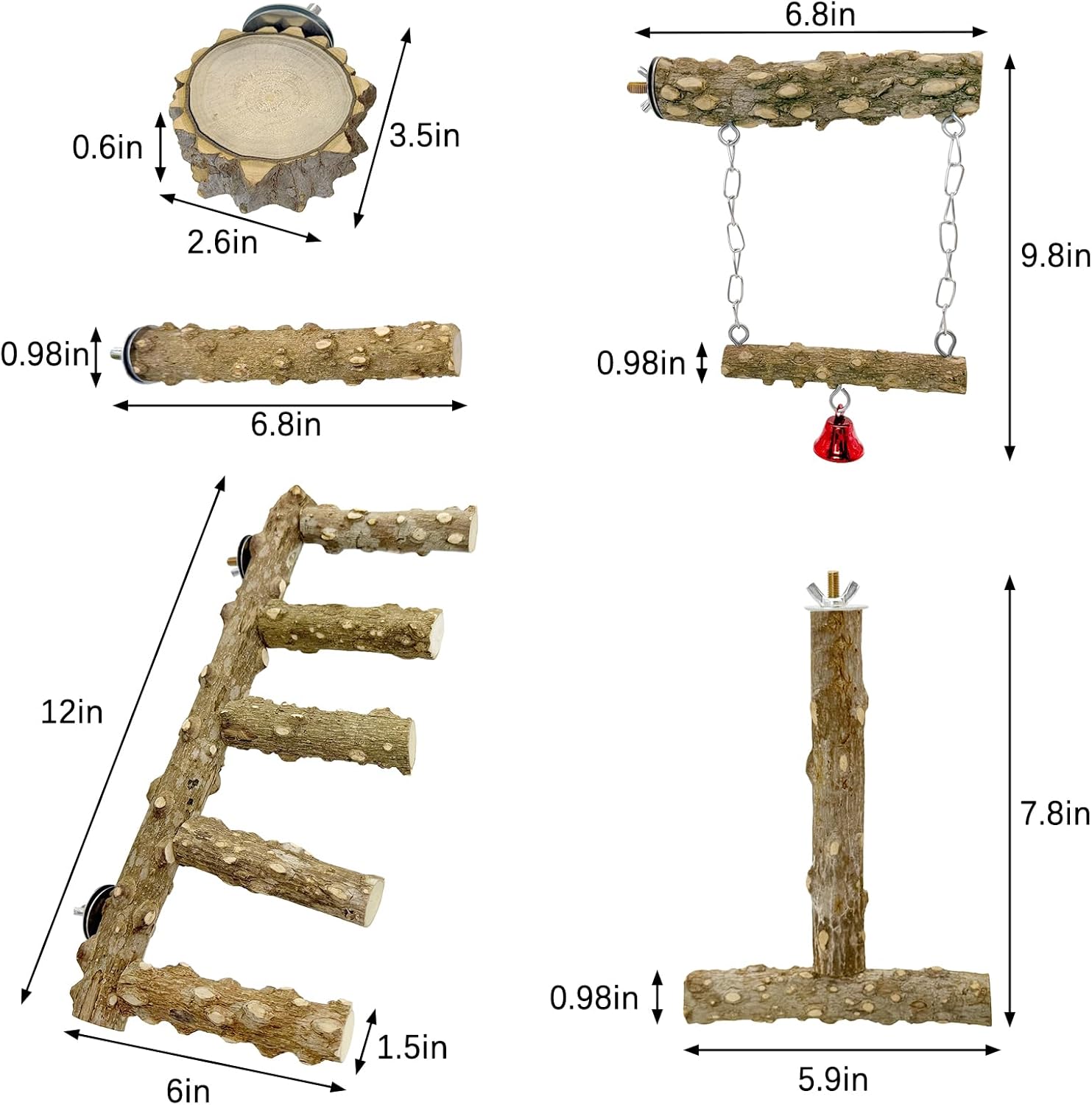 - 6Pack Bird Ladder Perches: Package includes Bird ladder X 1, T Shaped Perch X 1, O Shaped Paltform X 1, Wooden Perch X 2, Bird Swing X1. Design a natural bird habitat with varied perches to support daily rest, play, and instinctive behaviors