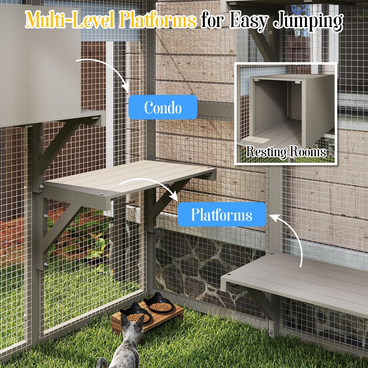 Cat Catio Outdoor Enclosure for Multiple Cats, Large Wooden Walk-in Cat House with Window Connection, 2 Condos, Platforms, Doors, and Weatherproof Roof Cover (69.5" L x 47" W x 71" H)