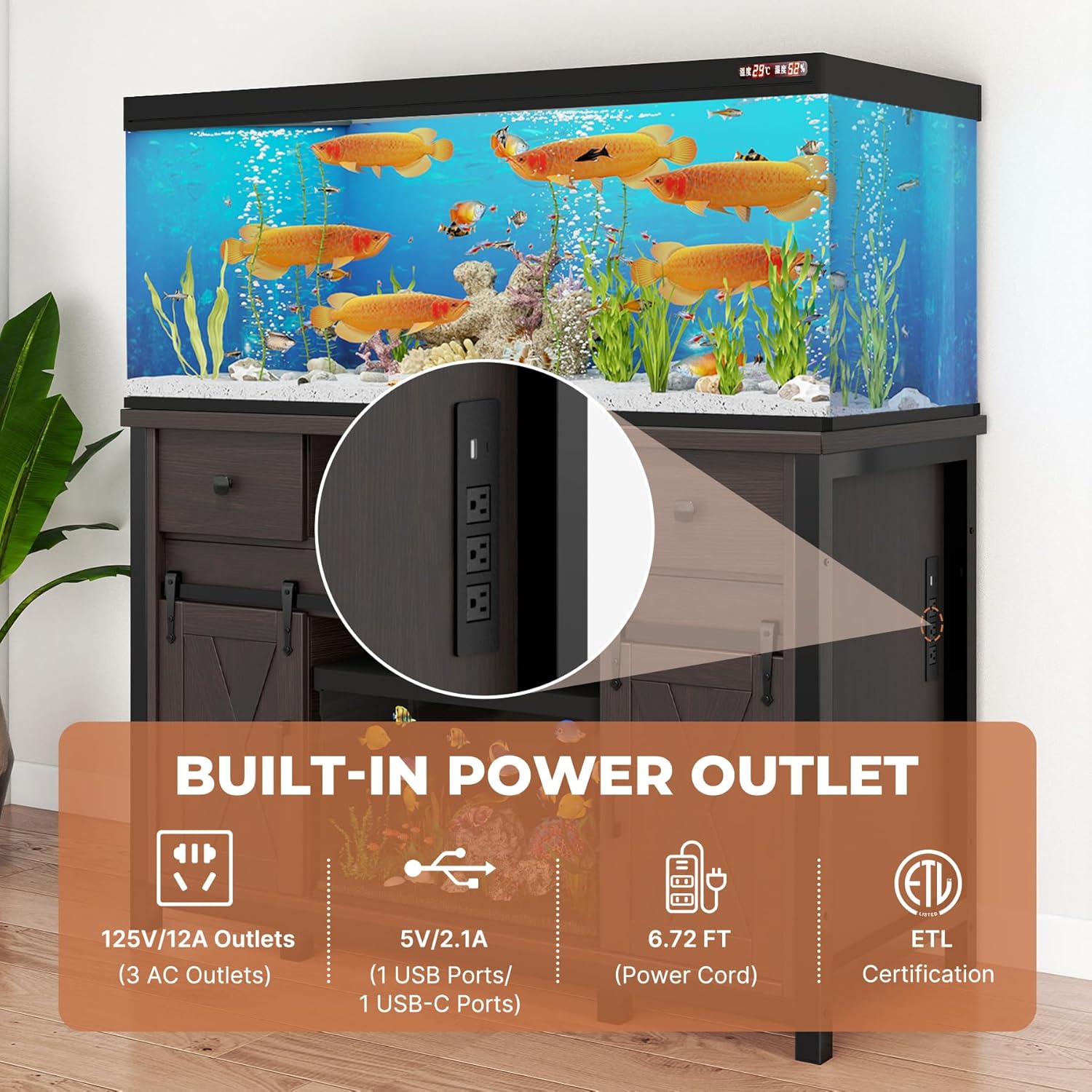 Miereirl 55-75 Gallon Fish Tank Stand with Power Outlet – Heavy Duty Aquarium Stand, Rustic Farmhouse Style, 800 lb Capacity, Adjustable Storage & Sliding Barn Doors, Dark Brown