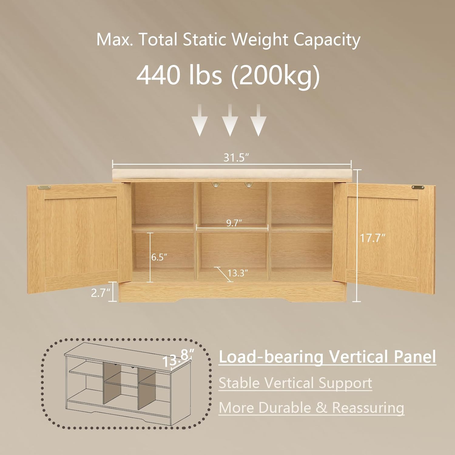 DINZI LVJ Shoe Bench, Entryway Storage Bench with Doors, Cushion, 2-Tier Shoe Rack with 6-Cubby, 31.5”L x 13.8”W Shoe Organizer Cabinet, Adjustable Shelf, Living Room, Bedroom, Natural