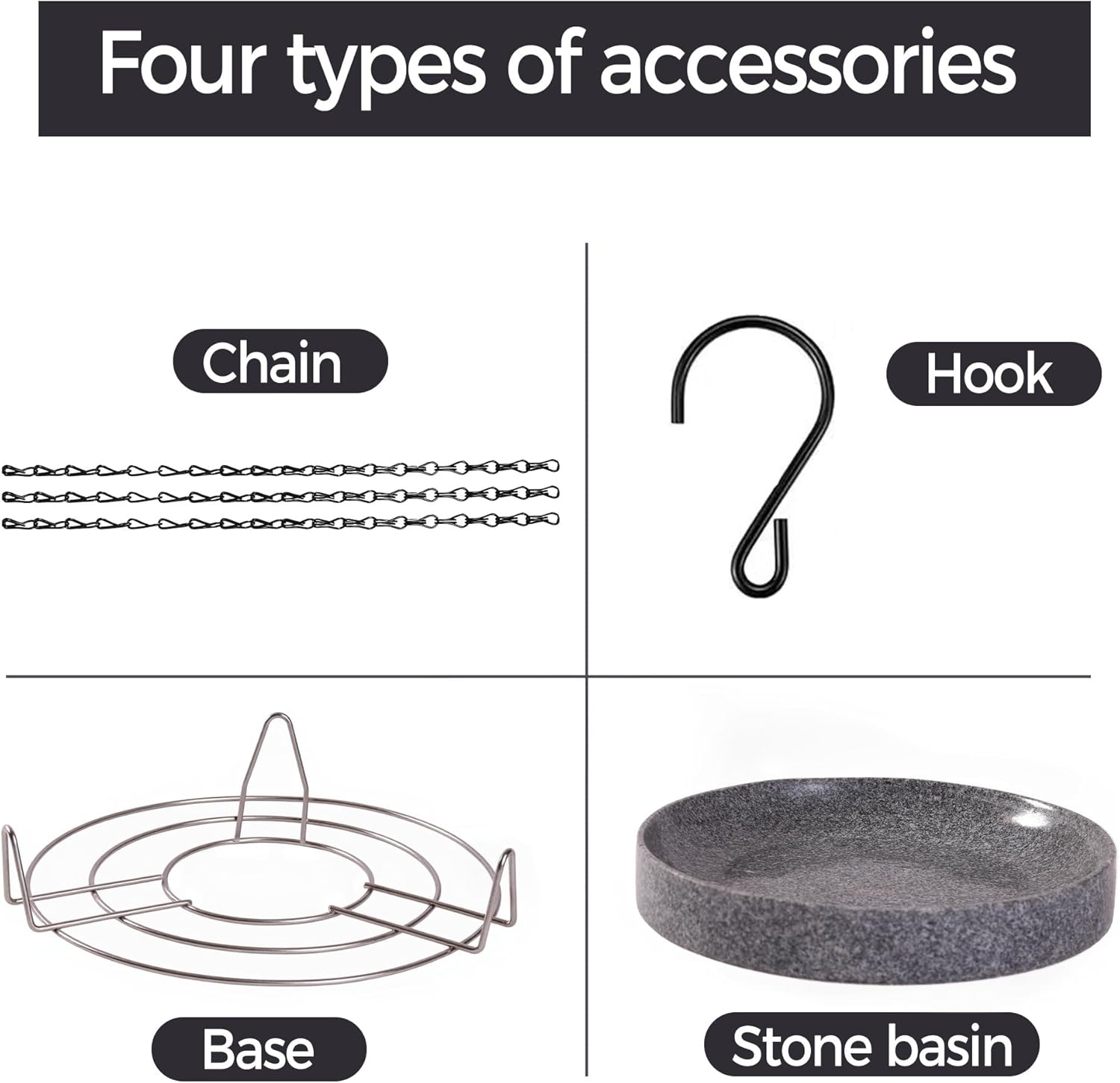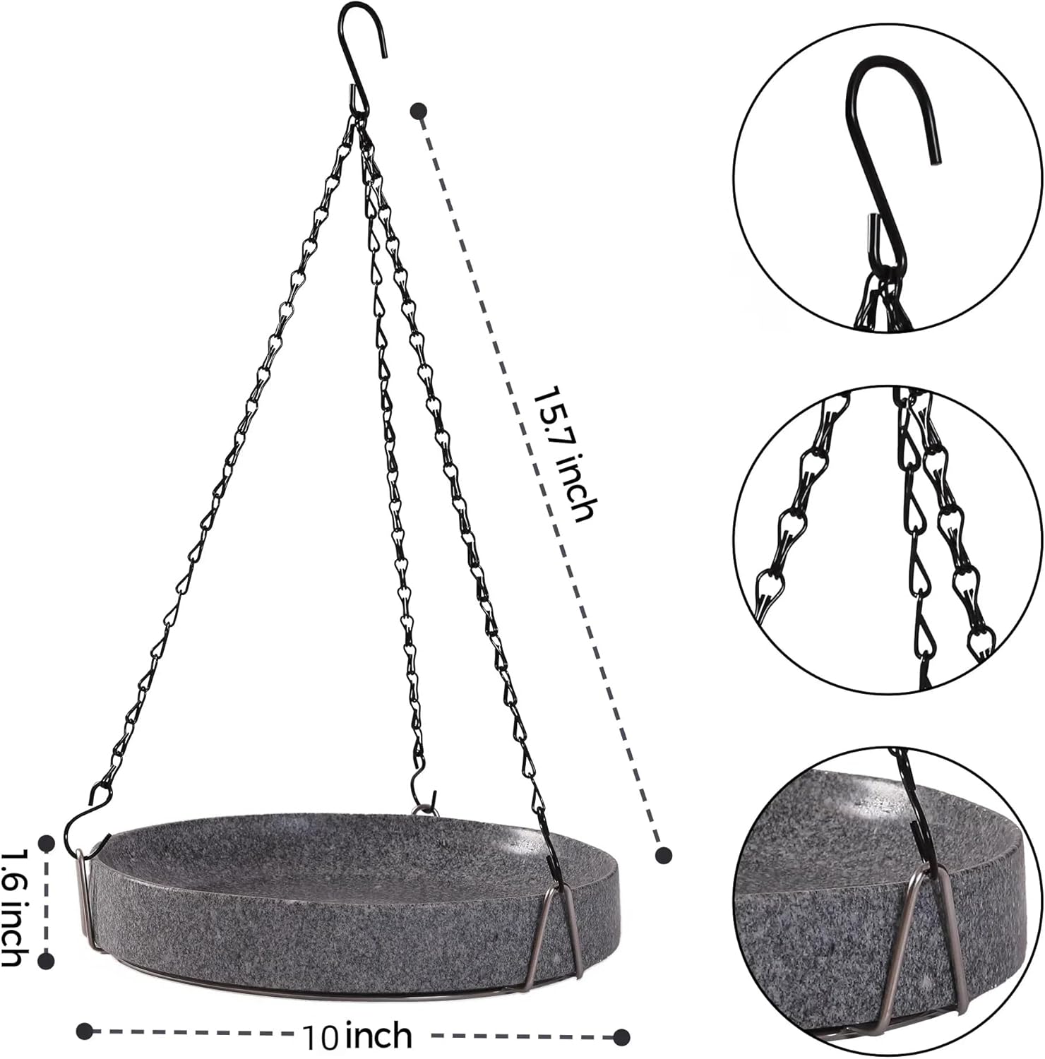 - Comes with 3 essential components : stone bird baths 10"L*10"W *1.6"D, Hanging Chain 15.7 inches, and a metal base for stability. Everything you need to set up a charming bird bath in your garden right away.
