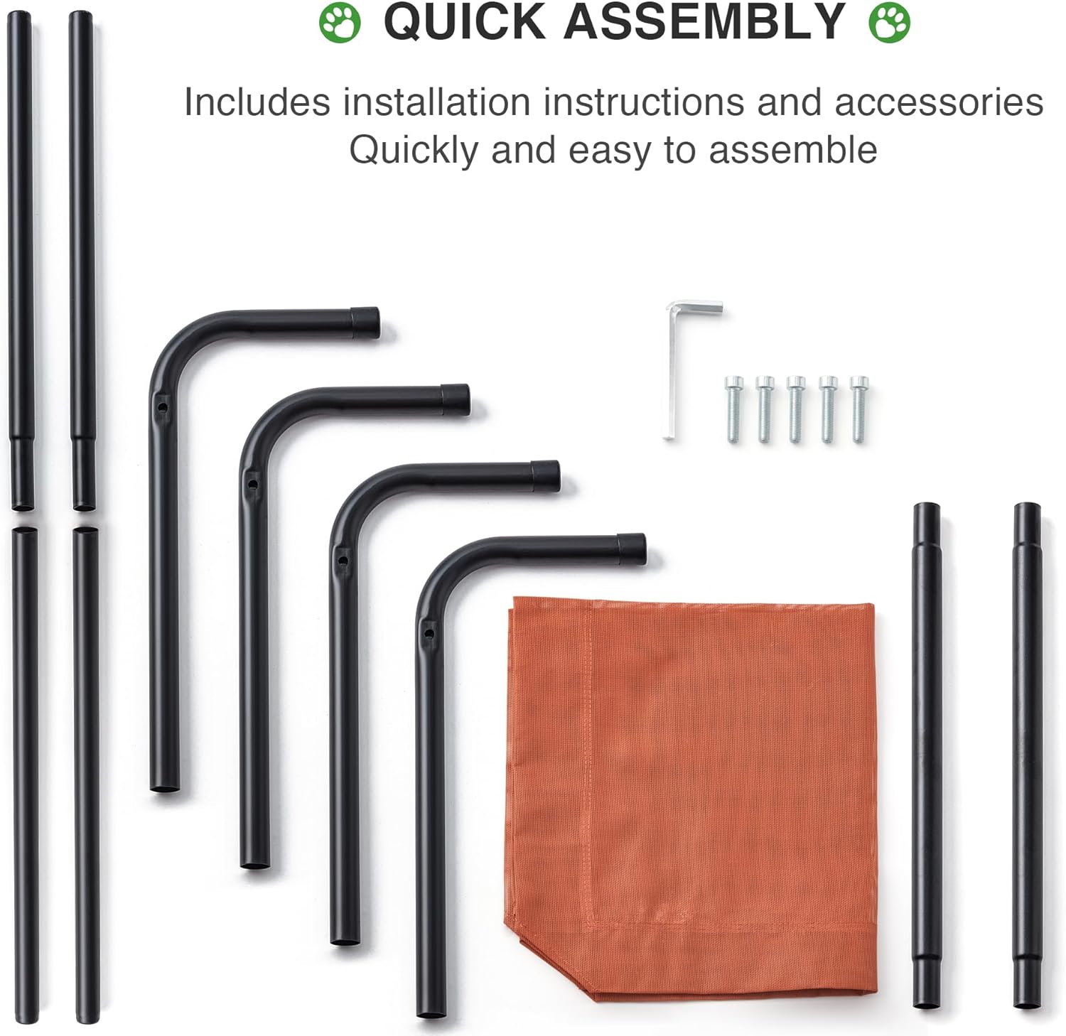 - EASY TO ASSEMBLE: Easy to assemble and disassemble for transport, including: 1 mesh, 4 legs, 2 leg extension rods, 4 cross support extension rods, 4 screws (WONâT rust) and 1 hex key. Off-the-ground design is perfect for both indoors and outdoors, you can place a dog pad on top of the mesh like a mattress to make it softer in your living room, also it is convenient for traveling, camping, hiking, fishing, BBQ, etc .