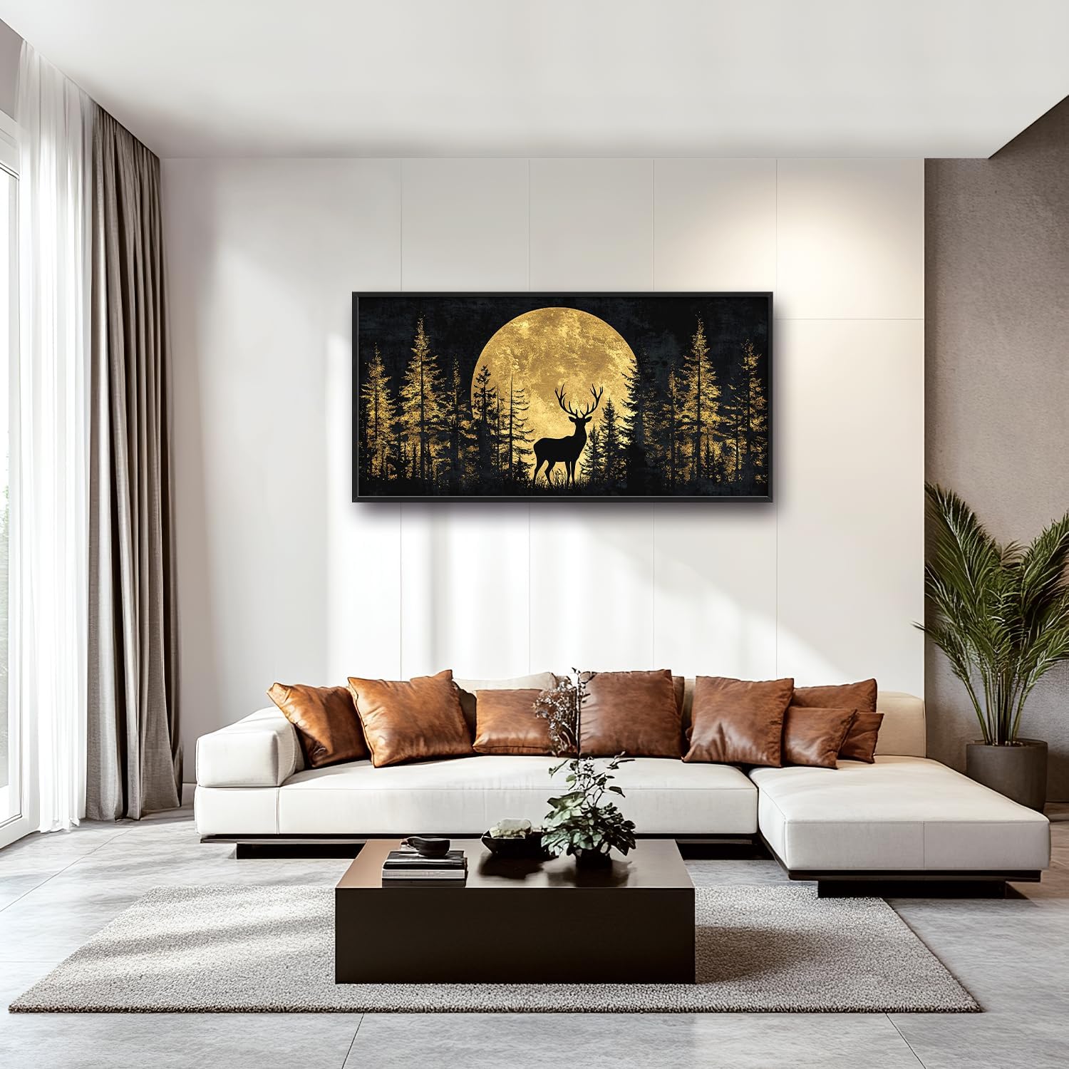 Large Moon Deer Forest Wall Art for Living Room, Black Gold Canvas Oversized Wall Decor, Elk Animal Framed Pictures Painting Print Artwork for Bedroom Office 60L" x 30W"
