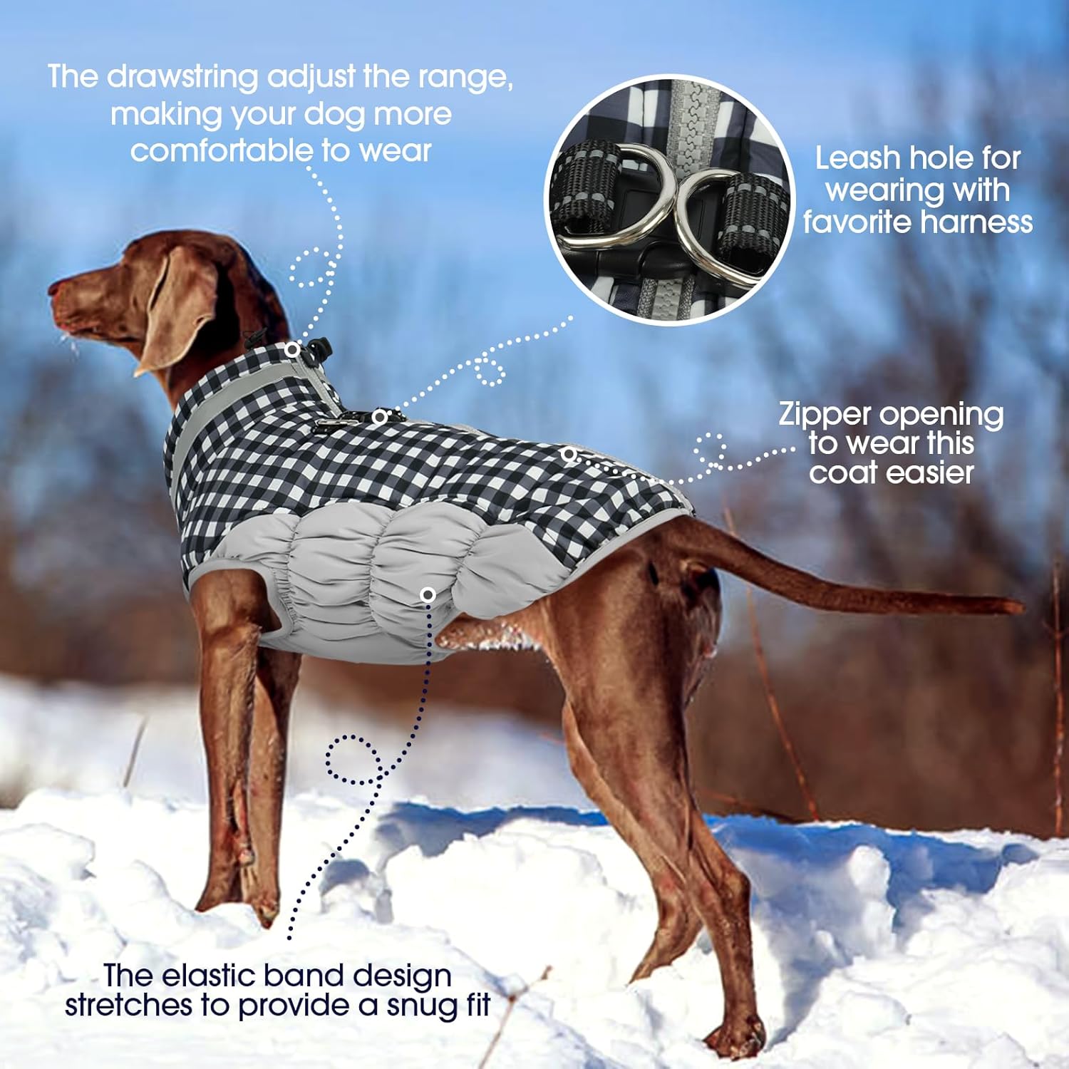 FUAMEY Dog Coat for Large Dogs,Waterproof Dog Winter Jacket with Harness Built in Puppy Cold Weather Coats Reflective Pet Vest with Zipper Warm Fleece Dogs Snowsuit Windproof Checkerboard 2XL