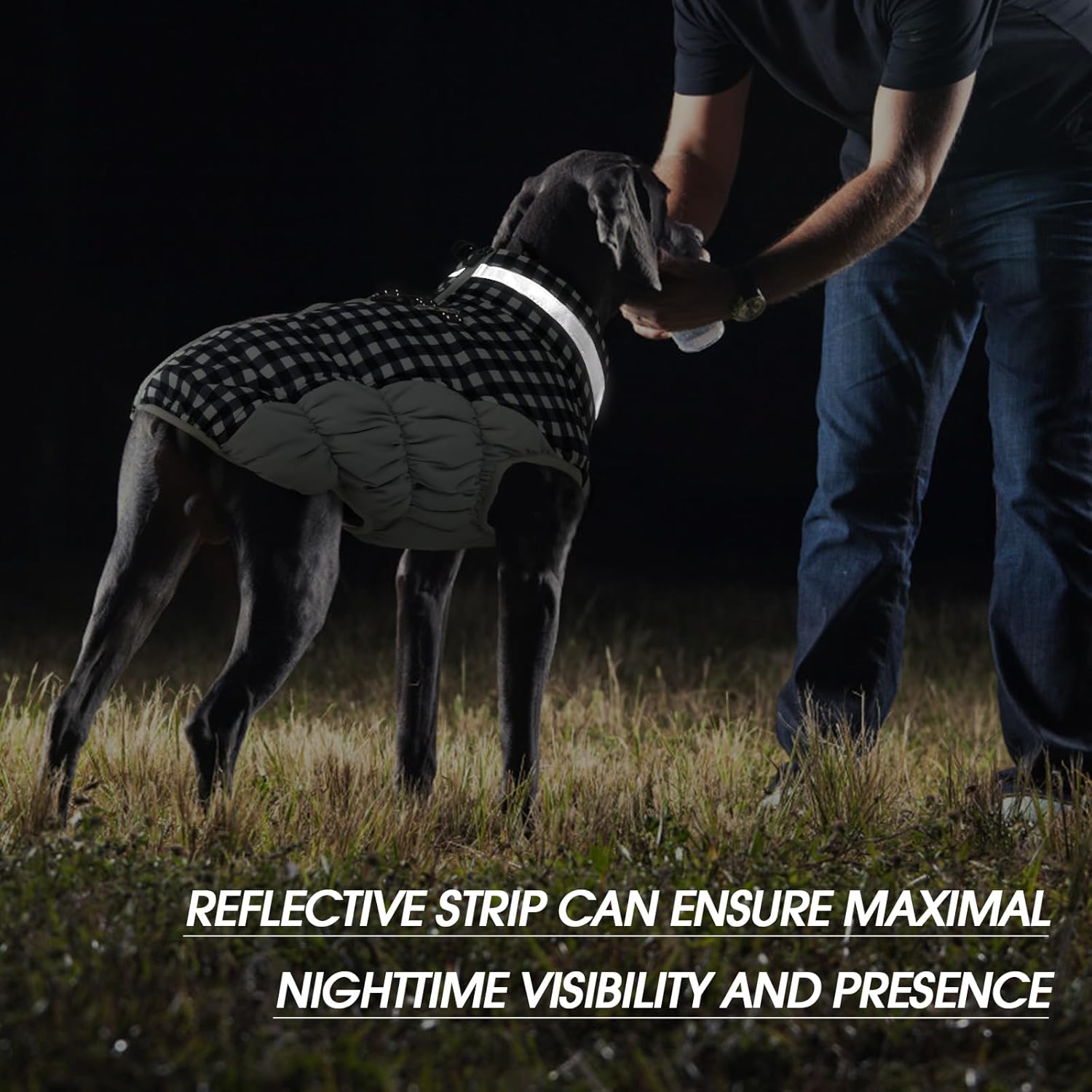 FUAMEY Dog Coat for Large Dogs,Waterproof Dog Winter Jacket with Harness Built in Puppy Cold Weather Coats Reflective Pet Vest with Zipper Warm Fleece Dogs Snowsuit Windproof Checkerboard 3XL
