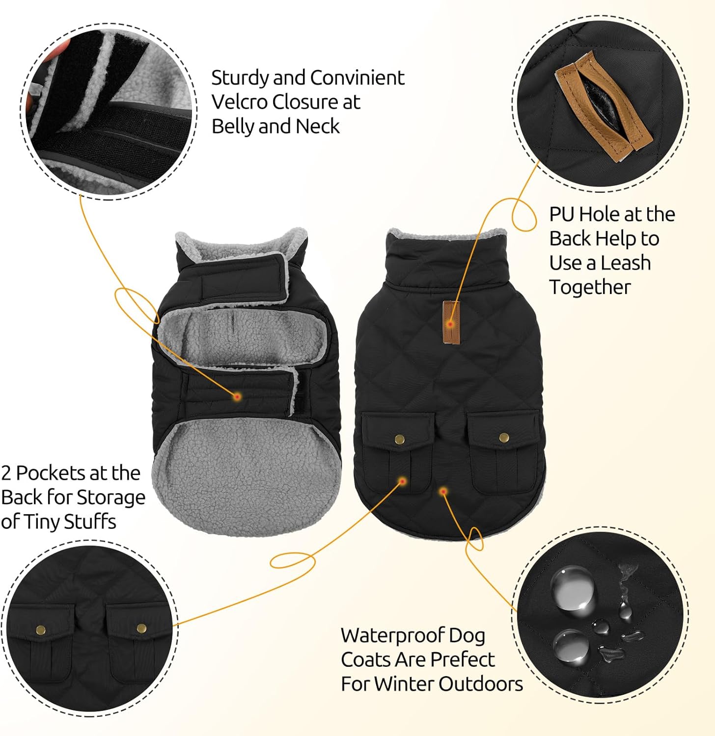 - CUTE STORAGE POCKETS AT THE BACK - The stylish quilting pockets at the back are eye-catching. It is easy to store some snacks, garbage bag or the leash to the storage pockets at the back of the dog jacket.