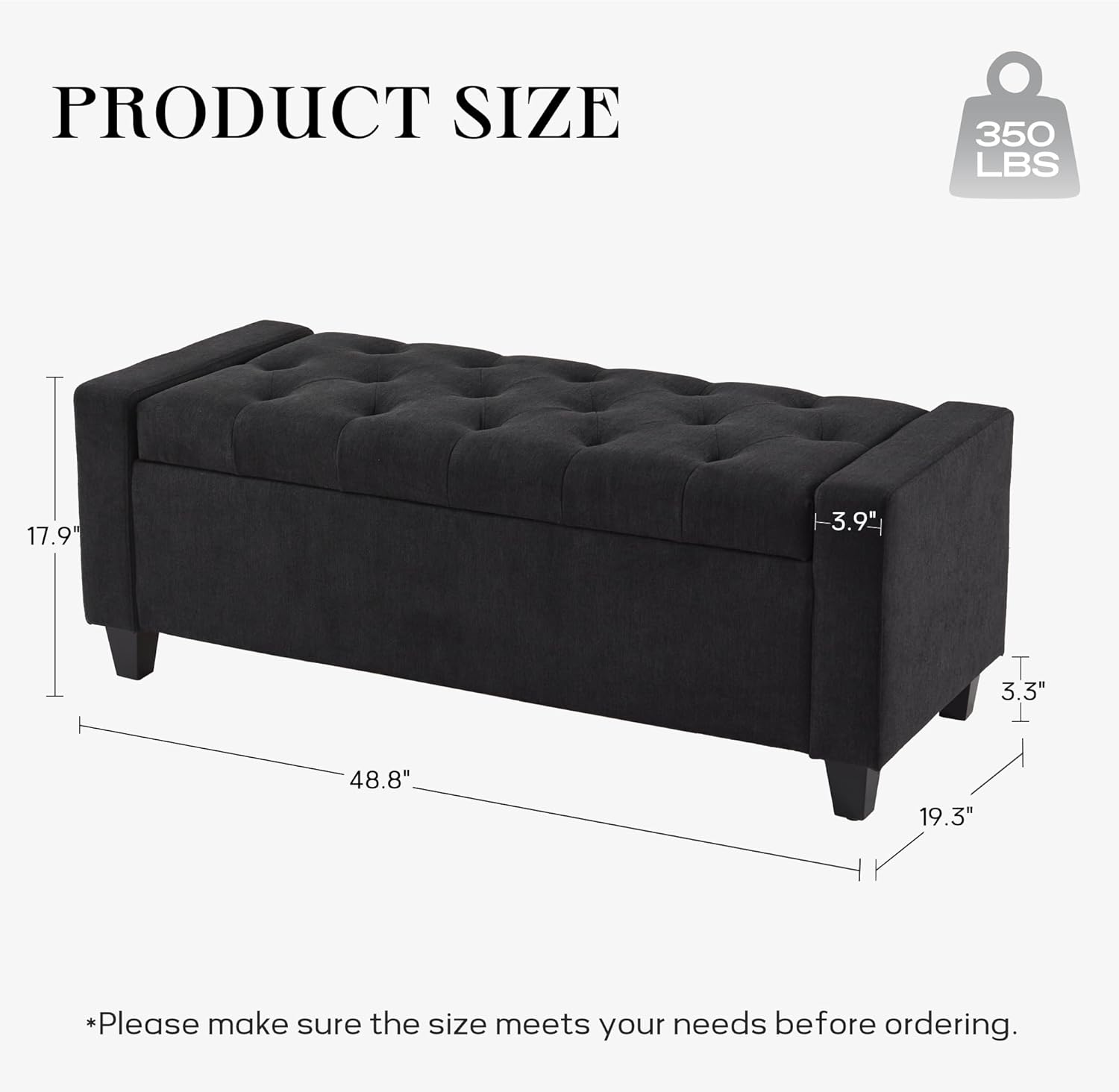 - VERSATILE USE: The bed bench has an upholstered top that is ideal for extra seating, and it also offers hidden storage space for household items. Overall size: 48.8"W x 19.3"D x 17.9"H, interior storage space size: 39.4"W x 16.1"D x 9.8"H. Suitable for any room: bedroom, living room, dining room, entryway