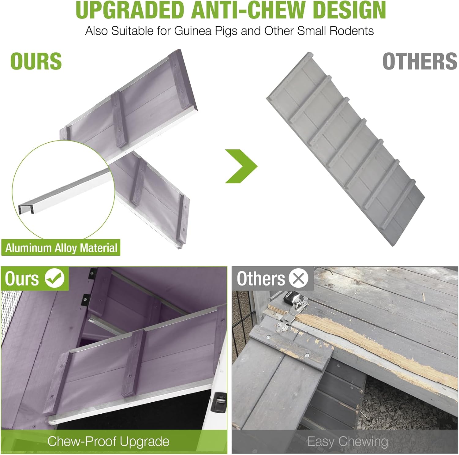- Reinforced Chew-Resistant Design: The access ramp features aluminum alloy-reinforced edges to discourage chewing by rabbits and other small pets, enhancing the hutchâs long-term durability. This sturdy design protects against wear and tear, ensuring lasting use.